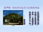昭君墓昭君自有千秋在胡汉和亲识见高---董必武第14课冒顿单于历史与现实1、匈奴族的贡献:(1)匈奴族用勤劳的双手,开发了祖国的北疆。(2)第一次实现了蒙古草原的统一,为以后全国性的统一创造了条件。(3)他们创造的匈奴文化丰富了祖国的文化宝库。汉、匈人民密切的政治、经济和文化联系,共同缔造着祖国历史。2、今天56个民族中已没有匈奴族。汉与匈奴三大战役示意图卫青,河东平阳人。卫皇后弟。本平阳公主家奴,后被汉武帝重用,官至大将军,即最高的军事将领。多次带兵同匈奴作战,屡立战功。史书说:卫青为人,谦虚爱士,深得