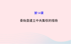 第14课秦始皇建立中央集权的措施一、政治上1.措施:2.影响:(1)国家通过___________________管理人民、征收赋税。(2)_________成为社会组织的基本单位,此后历代王朝基本沿用。二、经济、文化上1.经济上:(1)统一车辆形制。(2)统一货币,以___________为标准样式。(3)统一___________制度。2.文化上:统一文字。(1)以_____为标准文字。(2)后推行一种新字体——“_____”。(3)对中央集权国家___________、文化的传播和发展都起到了重要作