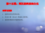 第十五课:两汉的科技和文化※知识梳理东汉时期,改进造纸术医学成就文化思想传入中国※同步训练3.有一位老中医善于养生之道,每天坚持锻炼,其所表现出来的虎、熊、鹿、猿、鸟各种形态惟妙惟肖,许多一同晨练的人为之叹服。请问这种健身方法是古代哪位医学家创编的?()A.扁鹊B.张仲景C.华佗D.孙思邈4.“自古书契多编以竹简,其用缣帛(即按书写需要裁好的丝织品)者谓之为纸。缣贵而简重,并不便于人。乃造意(发明、创造)用树肤、麻头及敝布、鱼网以为纸。”文中的记载是下列哪一人物的发明?()A.毕昇B.蔡伦C.李时珍D.宋