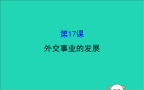 第17课外交事业的发展一、恢复在联合国的合法席位1.背景:在_____等国家的操纵下,联合国长期将中华人民共和国排斥在外。为争取恢复_________,中华人民共和国进行了长期的努力,得到越来越多的国家的支持。2.概况:_____年10月,第___届联合国大会通过决议,恢复中华人民共和国在联合国的一切合法权利。3.意义:这是中国_____上的重大胜利。中国积极参与国家事务,作为联合国安理会常任理事国之一,发挥了重要作用。二、中美、中日建交1.中美建交:(1)背景。①敌对:美国政府敌视新中国,对新中国实行封