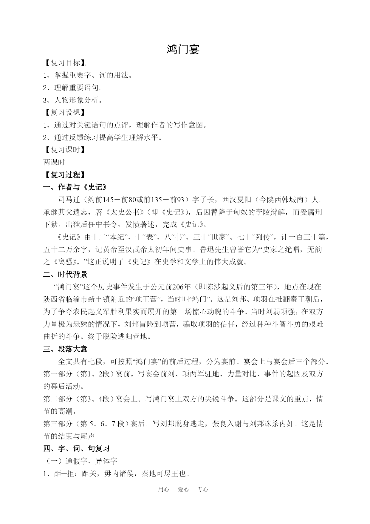 用心爱心专心鸿门宴【复习目标】。1、掌握重要字、词的用法。2、理解重要语句。3、人物形象分析。【复习设想】1、通过对关键语句的点评,理解作者的写作意图。2、通过反馈练习提高学生理解水平。【复习课时】两课时【复习过程】一、作者与《史记》司马迁(约前145-前80或前135-前93)字子长,西汉夏阳(今陕西韩城南)人。承继其父遗志,著《太史公书》(即《史记》),后因替降子匈奴的李陵辩解,而受腐刑下狱。出狱后任中书令,发愤著述,完成《史记》。《史记》由十二“本纪”、十“表”、八“书”、三十“世家”、七十“列传”