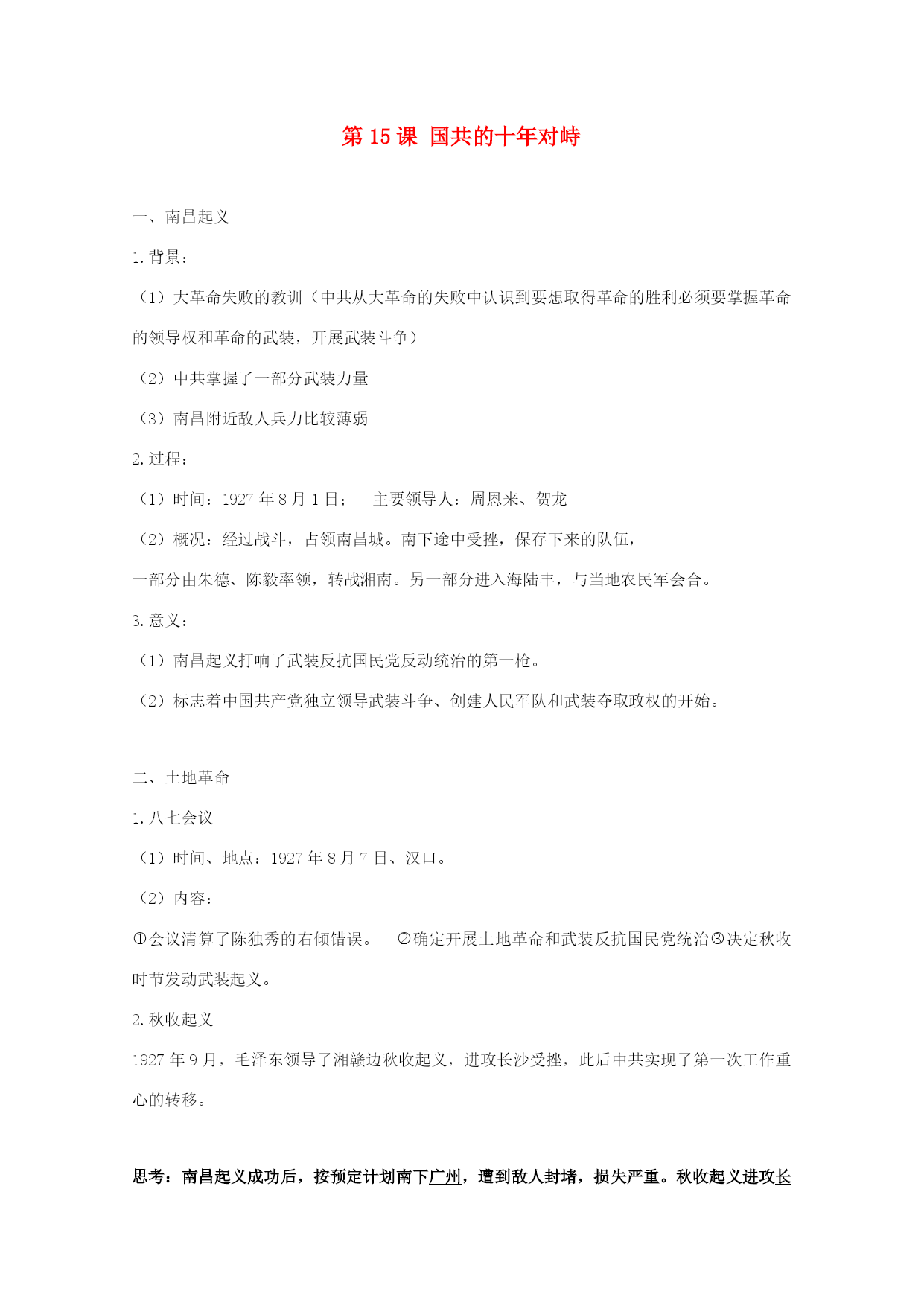 第15课国共的十年对峙一、南昌起义1.背景:(1)大革命失败的教训(中共从大革命的失败中认识到要想取得革命的胜利必须要掌握革命的领导权和革命的武装,开展武装斗争)(2)中共掌握了一部分武装力量(3)南昌附近敌人兵力比较薄弱2.过程:(1)时间:1927年8月1日;主要领导人:周恩来、贺龙(2)概况:经过战斗,占领南昌城。南下途中受挫,保存下来的队伍,一部分由朱德、陈毅率领,转战湘南。另一部分进入海陆丰,与当地农民军会合。3.意义:(1)南昌起义打响了武装反抗国民党反动统治的第一枪。(2)标志着中国共产党独