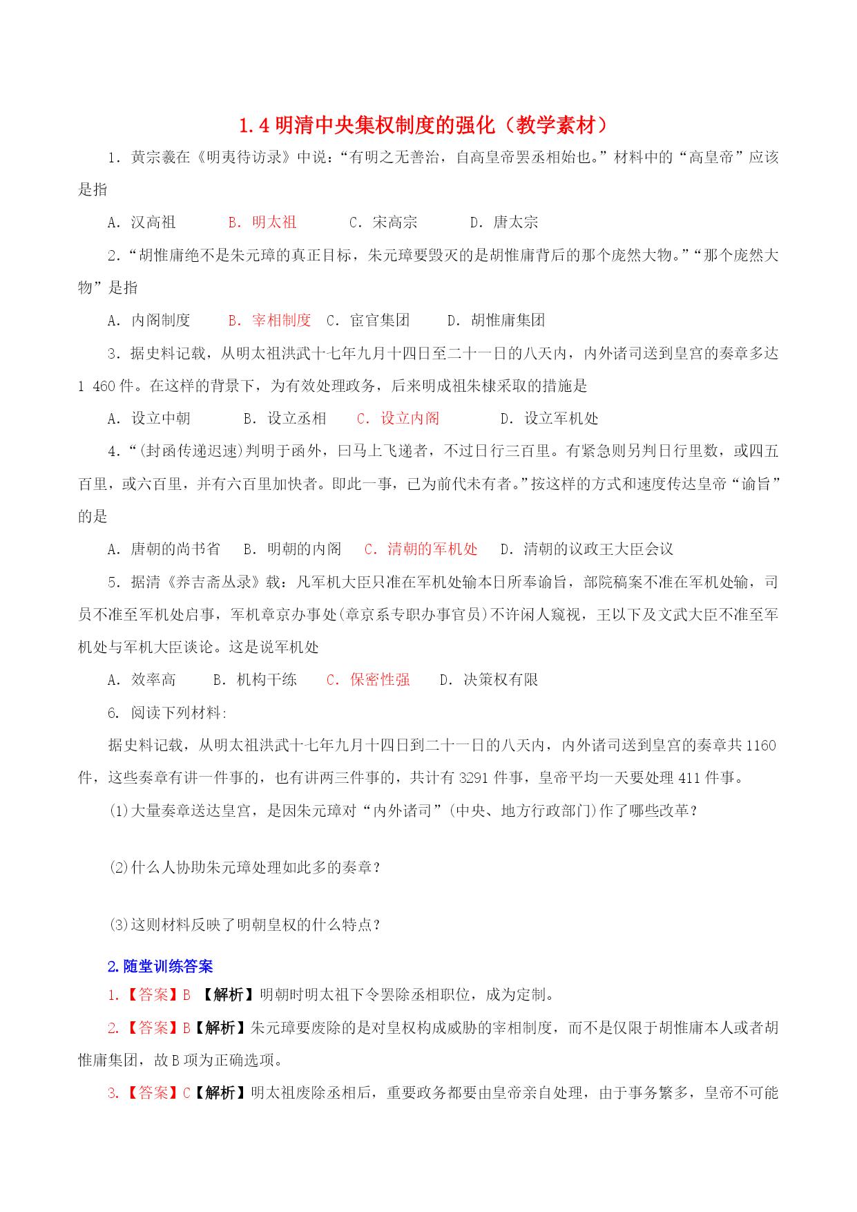 1.4明清中央集权制度的强化(教学素材)1.黄宗羲在《明夷待访录》中说:“有明之无善治,自高皇帝罢丞相始也。”材料中的“高皇帝”应该是指A.汉高祖B.明太祖C.宋高宗D.唐太宗2.“胡惟庸绝不是朱元璋的真正目标,朱元璋要毁灭的是胡惟庸背后的那个庞然大物。”“那个庞然大物”是指A.内阁制度B.宰相制度C.宦官集团D.胡惟庸集团3.据史料记载,从明太祖洪武十七年九月十四日至二十一日的八天内,内外诸司送到皇宫的奏章多达1460件。在这样的背景下,为有效处理政务,后来明成祖朱棣采取的措施是A.设立中朝B.设立丞相