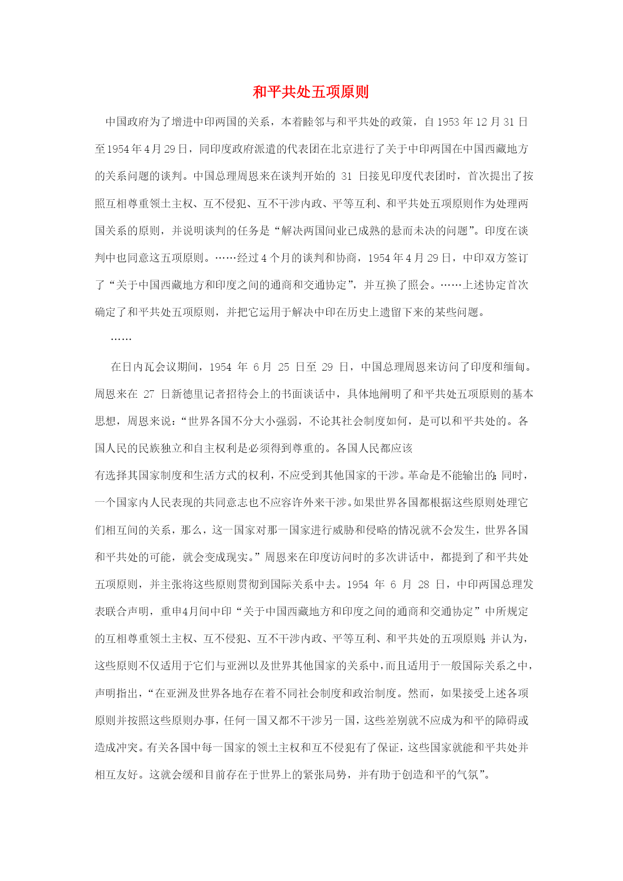 和平共处五项原则中国政府为了增进中印两国的关系,本着睦邻与和平共处的政策,自1953年12月31日至1954年4月29日,同印度政府派遣的代表团在北京进行了关于中印两国在中国西藏地方的关系问题的谈判。中国总理周恩来在谈判开始的31日接见印度代表团时,首次提出了按照互相尊重领土主权、互不侵犯、互不干涉内政、平等互利、和平共处五项原则作为处理两国关系的原则,并说明谈判的任务是“解决两国间业已成熟的悬而未决的问题”。印度在谈判中也同意这五项原则。……经过4个月的谈判和协商,1954年4月29日,中印双方签订了“