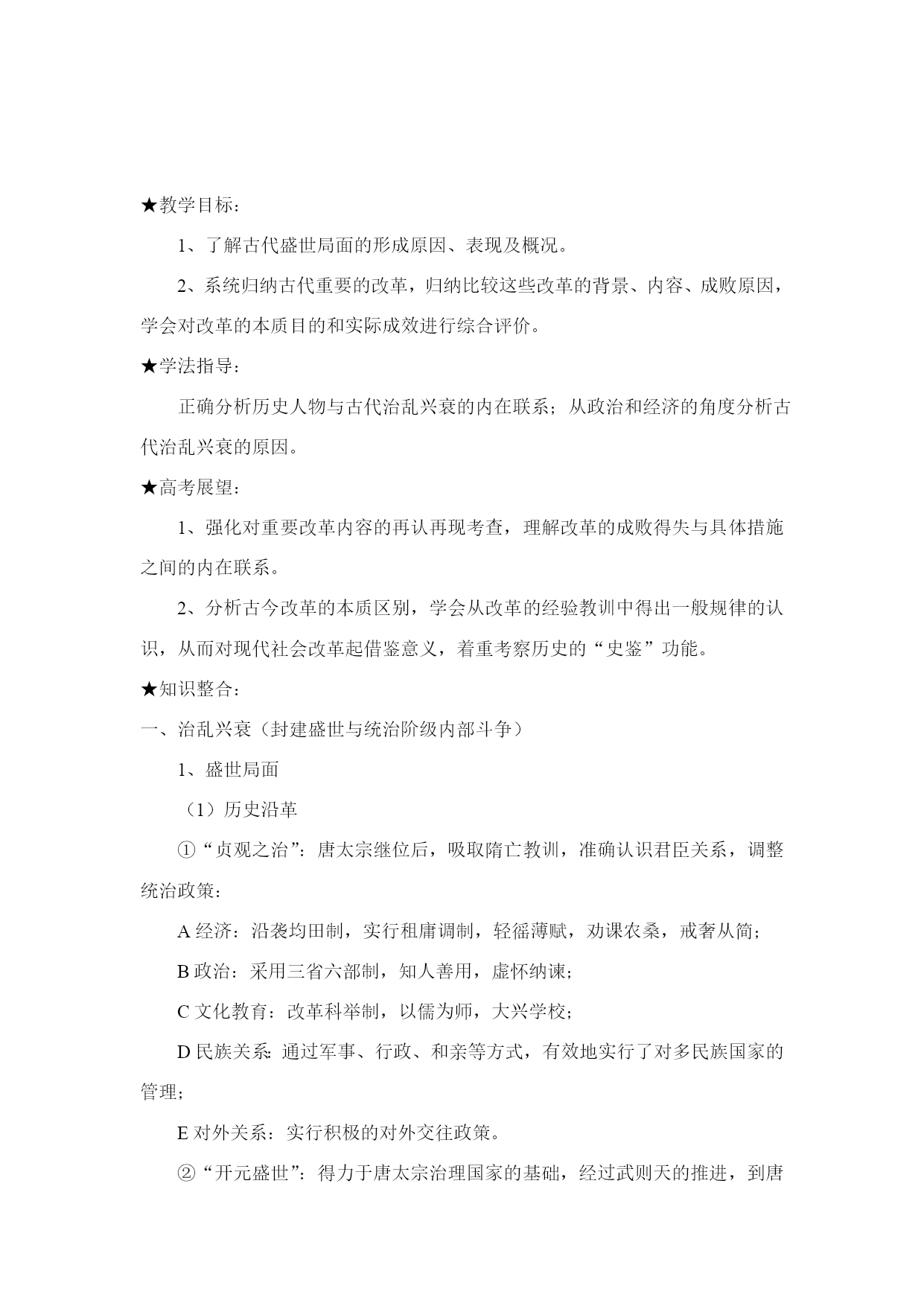 ★教学目标:1、了解古代盛世局面的形成原因、表现及概况。2、系统归纳古代重要的改革,归纳比较这些改革的背景、内容、成败原因,学会对改革的本质目的和实际成效进行综合评价。★学法指导:正确分析历史人物与古代治乱兴衰的内在联系;从政治和经济的角度分析古代治乱兴衰的原因。★高考展望:1、强化对重要改革内容的再认再现考查,理解改革的成败得失与具体措施之间的内在联系。2、分析古今改革的本质区别,学会从改革的经验教训中得出一般规律的认识,从而对现代社会改革起借鉴意义,着重考察历史的“史鉴”功能。★知识整合:一、治乱兴衰