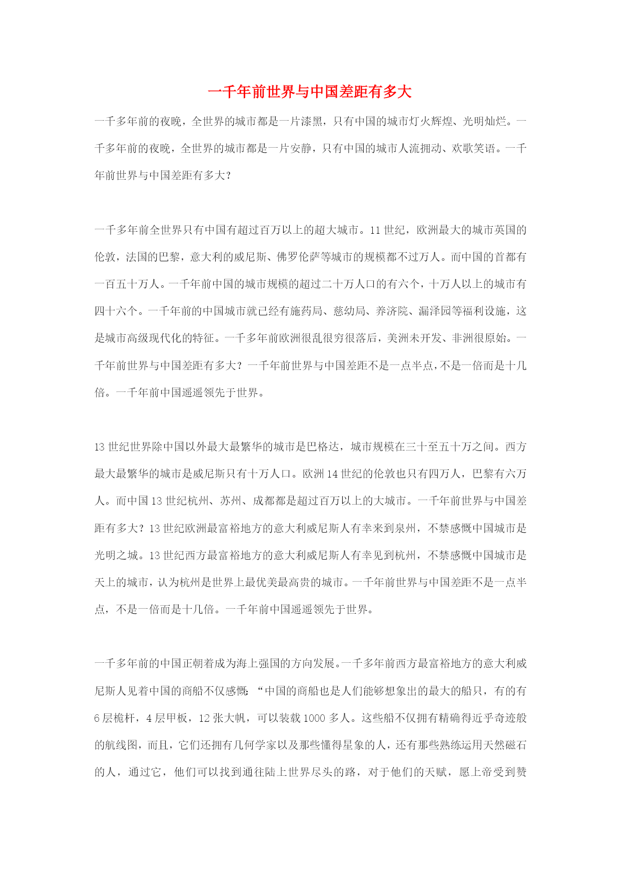 一千年前世界与中国差距有多大一千多年前的夜晚,全世界的城市都是一片漆黑,只有中国的城市灯火辉煌、光明灿烂。一千多年前的夜晚,全世界的城市都是一片安静,只有中国的城市人流拥动、欢歌笑语。一千年前世界与中国差距有多大?一千多年前全世界只有中国有超过百万以上的超大城市。11世纪,欧洲最大的城市英国的伦敦,法国的巴黎,意大利的威尼斯、佛罗伦萨等城市的规模都不过万人。而中国的首都有一百五十万人。一千年前中国的城市规模的超过二十万人口的有六个,十万人以上的城市有四十六个。一千年前的中国城市就已经有施药局、慈幼局、养济