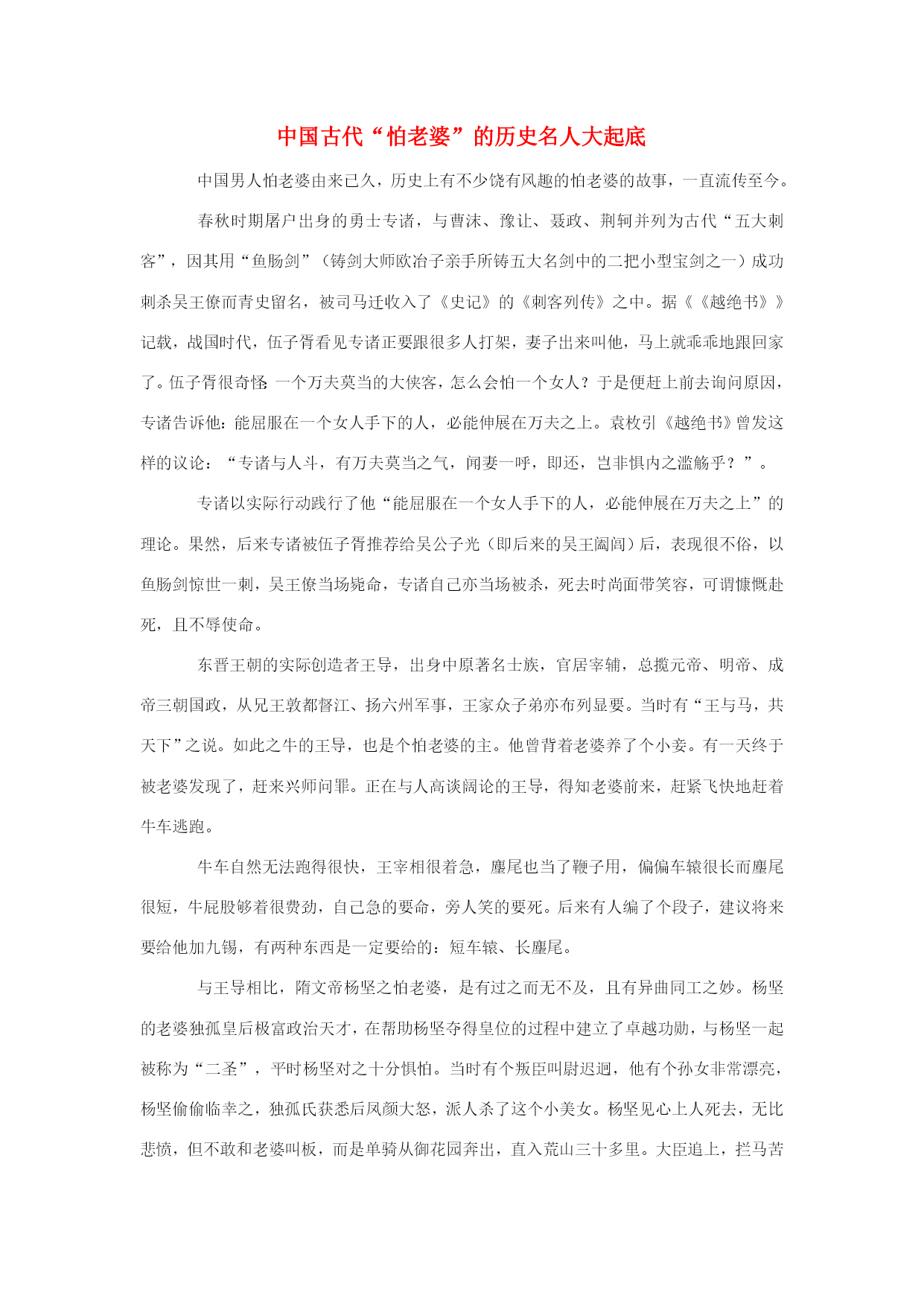 中国古代“怕老婆”的历史名人大起底中国男人怕老婆由来已久,历史上有不少饶有风趣的怕老婆的故事,一直流传至今。春秋时期屠户出身的勇士专诸,与曹沫、豫让、聂政、荆轲并列为古代“五大刺客”,因其用“鱼肠剑”(铸剑大师欧冶子亲手所铸五大名剑中的二把小型宝剑之一)成功刺杀吴王僚而青史留名,被司马迁收入了《史记》的《刺客列传》之中。据《《越绝书》》记载,战国时代,伍子胥看见专诸正要跟很多人打架,妻子出来叫他,马上就乖乖地跟回家了。伍子胥很奇怪:一个万夫莫当的大侠客,怎么会怕一个女人?于是便赶上前去询问原因,专诸告诉他
