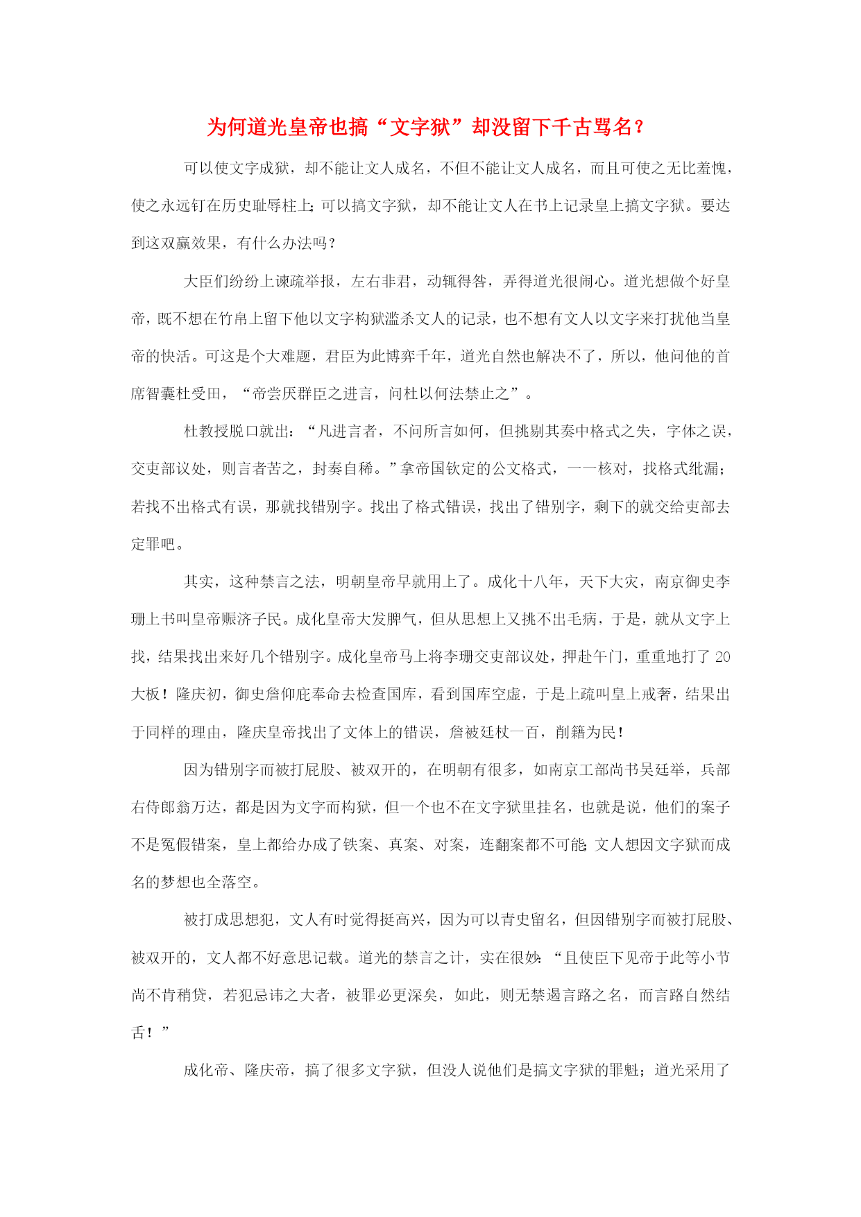 为何道光皇帝也搞“文字狱”却没留下千古骂名?可以使文字成狱,却不能让文人成名,不但不能让文人成名,而且可使之无比羞愧,使之永远钉在历史耻辱柱上;可以搞文字狱,却不能让文人在书上记录皇上搞文字狱。要达到这双赢效果,有什么办法吗?大臣们纷纷上谏疏举报,左右非君,动辄得咎,弄得道光很闹心。道光想做个好皇帝,既不想在竹帛上留下他以文字构狱滥杀文人的记录,也不想有文人以文字来打扰他当皇帝的快活。可这是个大难题,君臣为此博弈千年,道光自然也解决不了,所以,他问他的首席智囊杜受田,“帝尝厌群臣之进言,问杜以何法禁止之”