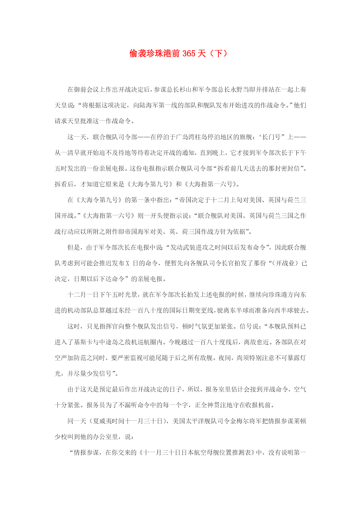 偷袭珍珠港前365天(下)在御前会议上作出开战决定后,参谋总长杉山和军令部总长永野当即并排站在一起上奏天皇说:“将根据这项决定,向陆海军第一线的部队和舰队发布开始进攻的作战命令。”他们请求天皇批准这一作战命令。这一天,联合舰队司令部——在停泊于广岛湾柱岛停泊地区的旗舰:‘长门号”上——从一清早就开始迫不及待地等待着决定开战的通知,直到晚上,它才接到军令部次长于下午五时发出的一份亲展电报。这份电报指示联合舰队司令部“拆看前几天送去的那封密封信”。拆看后,才知道它原来是《大海令第九号》和《大海指第一六号》。在