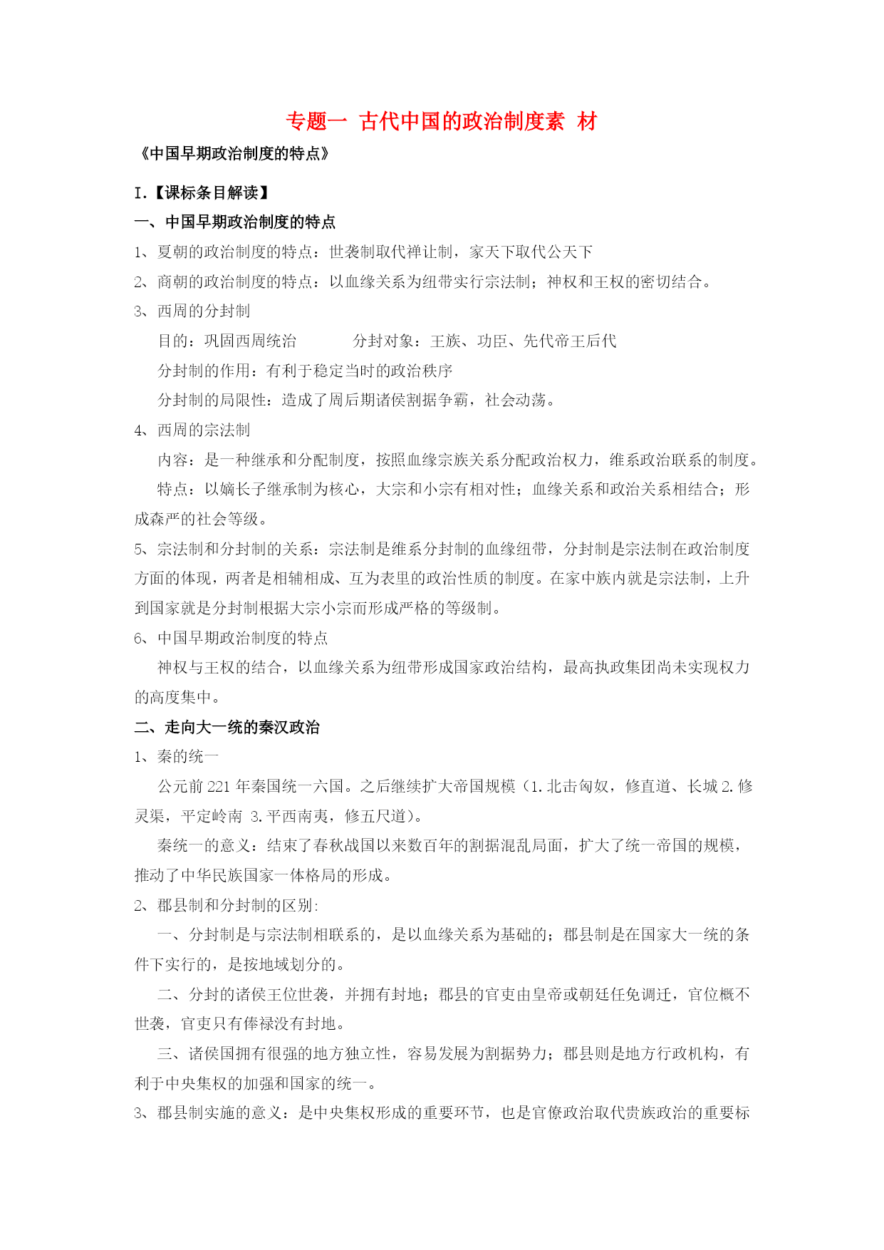 专题一古代中国的政治制度素材《中国早期政治制度的特点》I.【课标条目解读】一、中国早期政治制度的特点1、夏朝的政治制度的特点:世袭制取代禅让制,家天下取代公天下2、商朝的政治制度的特点:以血缘关系为纽带实行宗法制;神权和王权的密切结合。3、西周的分封制目的:巩固西周统治分封对象:王族、功臣、先代帝王后代分封制的作用:有利于稳定当时的政治秩序分封制的局限性:造成了周后期诸侯割据争霸,社会动荡。4、西周的宗法制内容:是一种继承和分配制度,按照血缘宗族关系分配政治权力,维系政治联系的制度。特点:以嫡长子继承制为