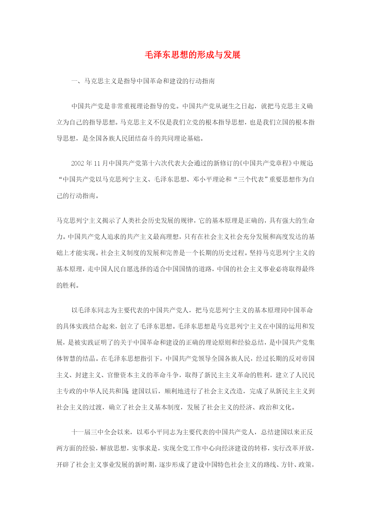 毛泽东思想的形成与发展一、马克思主义是指导中国革命和建设的行动指南中国共产党是非常重视理论指导的党。中国共产党从诞生之日起,就把马克思主义确立为自己的指导思想。马克思主义不仅是我们立党的根本指导思想,也是我们立国的根本指导思想,是全国各族人民团结奋斗的共同理论基础。2002年11月中国共产党第十六次代表大会通过的新修订的《中国共产党章程》中规定:“中国共产党以马克思列宁主义、毛泽东思想、邓小平理论和“三个代表”重要思想作为自己的行动指南。马克思列宁主义揭示了人类社会历史发展的规律,它的基本原理是正确的,具