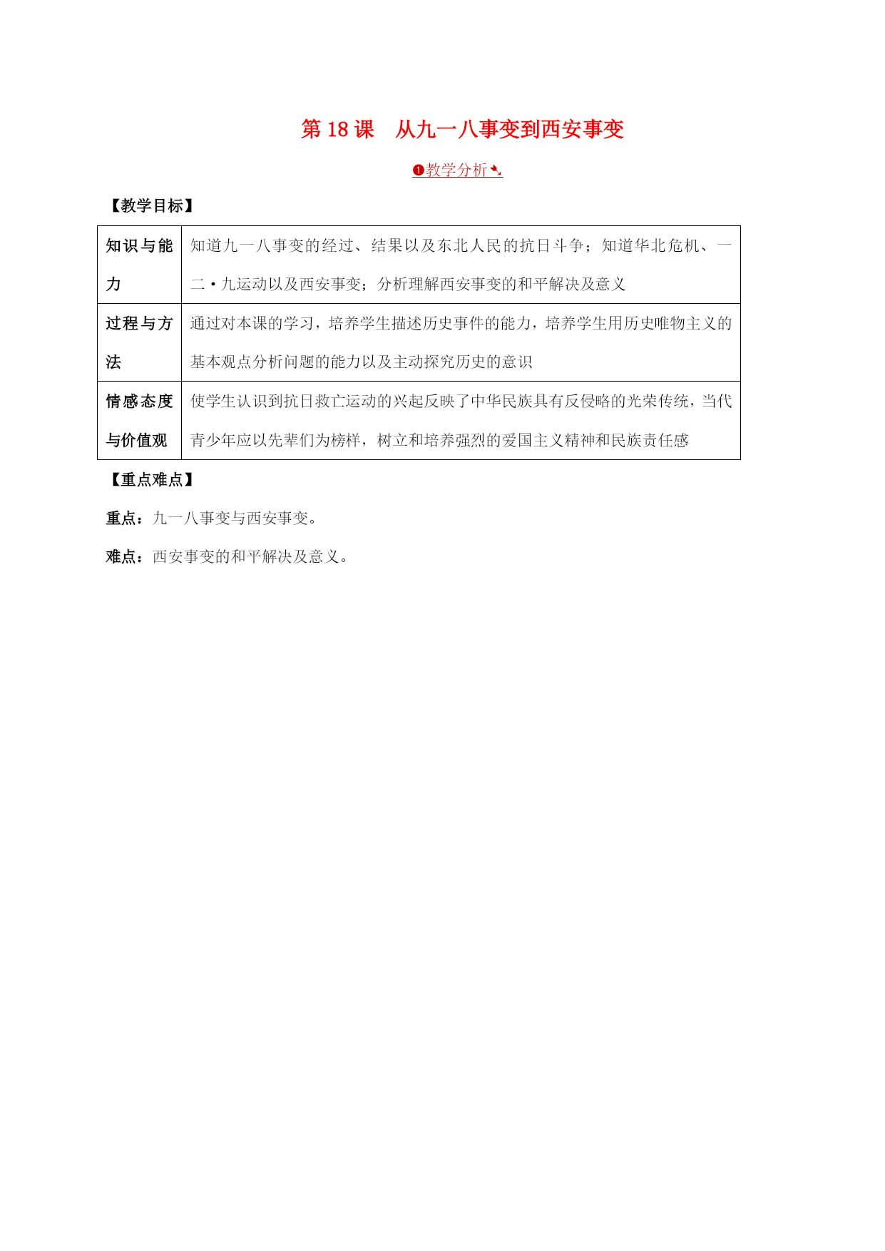第18课从九一八事变到西安事变❶教学分析➷【教学目标】知识与能力知道九一八事变的经过、结果以及东北人民的抗日斗争;知道华北危机、一二·九运动以及西安事变;分析理解西安事变的和平解决及意义过程与方法通过对本课的学习,培养学生描述历史事件的能力,培养学生用历史唯物主义的基本观点分析问题的能力以及主动探究历史的意识情感态度与价值观使学生认识到抗日救亡运动的兴起反映了中华民族具有反侵略的光荣传统,当代青少年应以先辈们为榜样,树立和培养强烈的爱国主义精神和民族责任感【重点难点】重点:九一八事变与西安事变。难点:西安