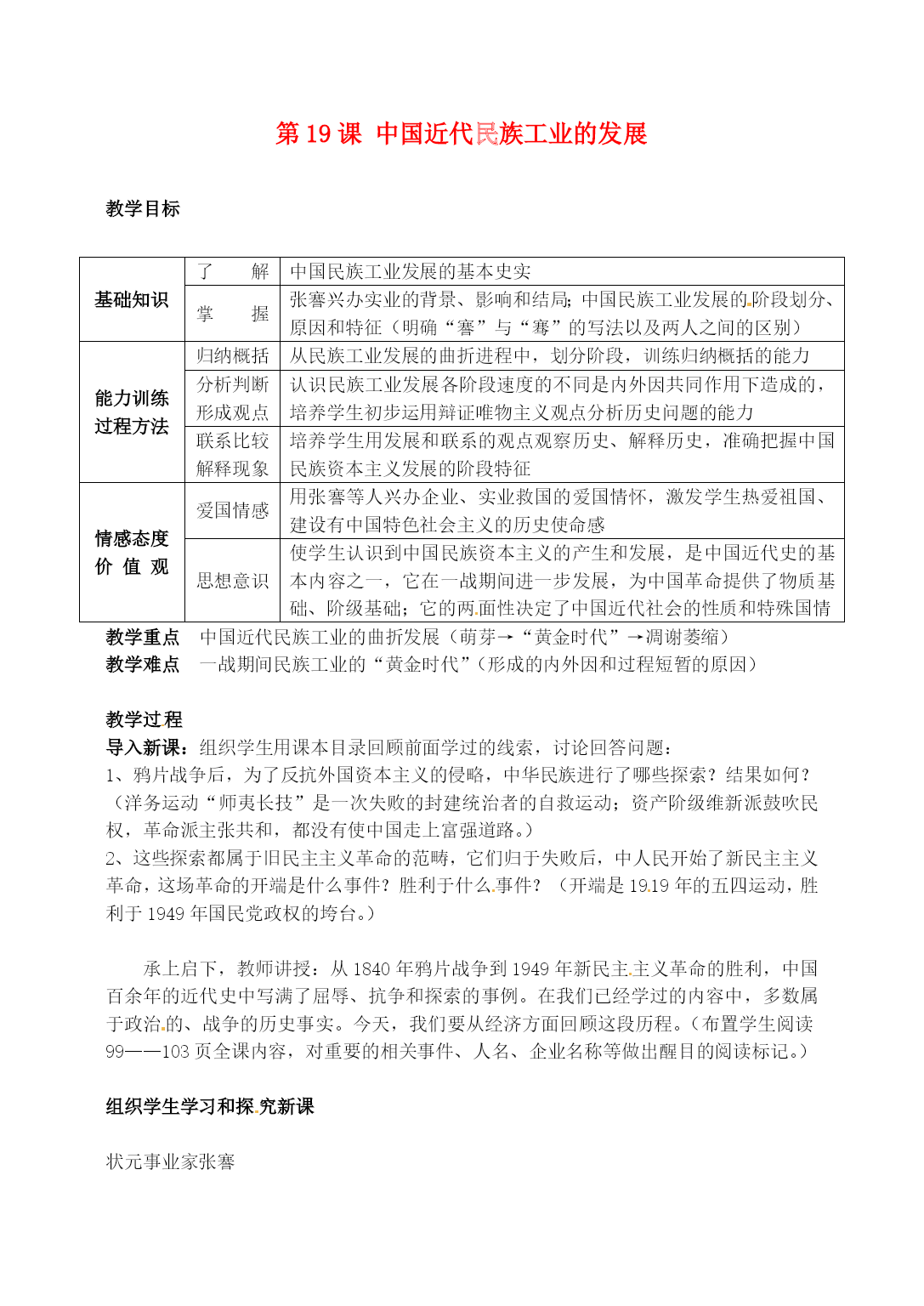 第19课中国近代民族工业的发展教学目标基础知识了解中国民族工业发展的基本史实掌握张謇兴办实业的背景、影响和结局;中国民族工业发展的阶段划分、原因和特征(明确“謇”与“骞”的写法以及两人之间的区别)能力训练过程方法归纳概括从民族工业发展的曲折进程中,划分阶段,训练归纳概括的能力分析判断形成观点认识民族工业发展各阶段速度的不同是内外因共同作用下造成的,培养学生初步运用辩证唯物主义观点分析历史问题的能力联系比较解释现象培养学生用发展和联系的观点观察历史、解释历史,准确把握中国民族资本主义发展的阶段特征情感态度价