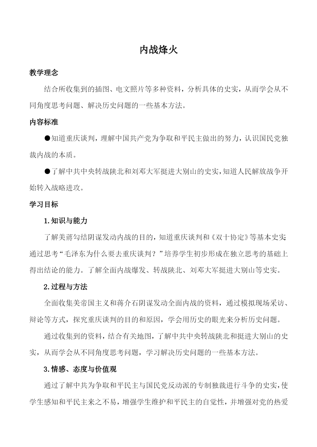 内战烽火教学理念结合所收集到的插图、电文照片等多种资料,分析具体的史实,从而学会从不同角度思考问题、解决历史问题的一些基本方法。内容标准●知道重庆谈判,理解中国共产党为争取和平民主做出的努力,认识国民党独裁内战的本质。●了解中共中央转战陕北和刘邓大军挺进大别山的史实,知道人民解放战争开始转入战略进攻。学习目标1.知识与能力了解美蔣勾结阴谋发动内战的目的,知道重庆谈判和《双十协定》等基本史实;通过思考“毛泽东为什么要去重庆谈判?”培养学生初步形成在独立思考的基础上得出结论的能力。了解全面内战爆发、转战陕北、