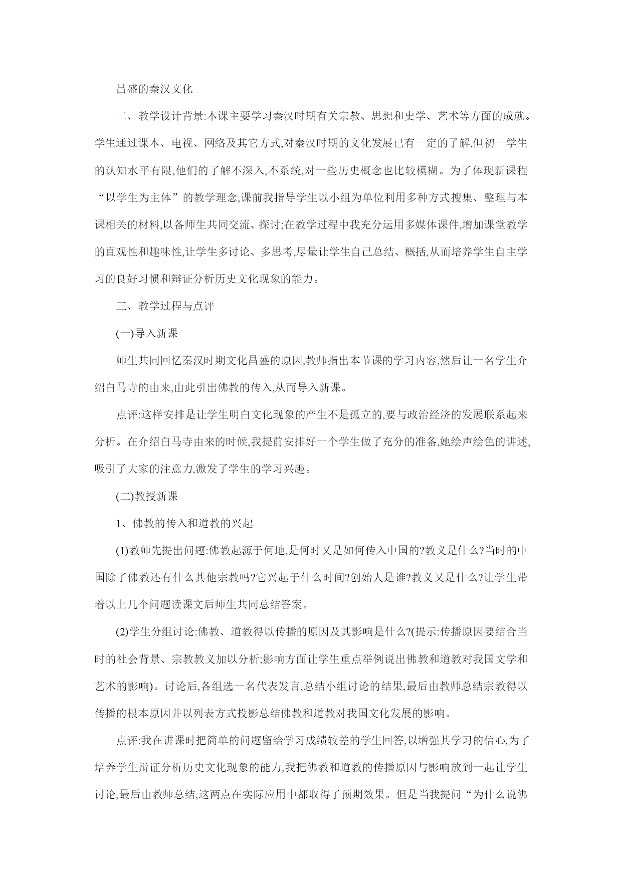 昌盛的秦汉文化二、教学设计背景:本课主要学习秦汉时期有关宗教、思想和史学、艺术等方面的成就。学生通过课本、电视、网络及其它方式,对秦汉时期的文化发展已有一定的了解,但初一学生的认知水平有限,他们的了解不深入,不系统,对一些历史概念也比较模糊。为了体现新课程“以学生为主体”的教学理念,课前我指导学生以小组为单位利用多种方式搜集、整理与本课相关的材料,以备师生共同交流、探讨;在教学过程中我充分运用多媒体课件,增加课堂教学的直观性和趣味性,让学生多讨论、多思考,尽量让学生自己总结、概括,从而培养学生自主学习的良