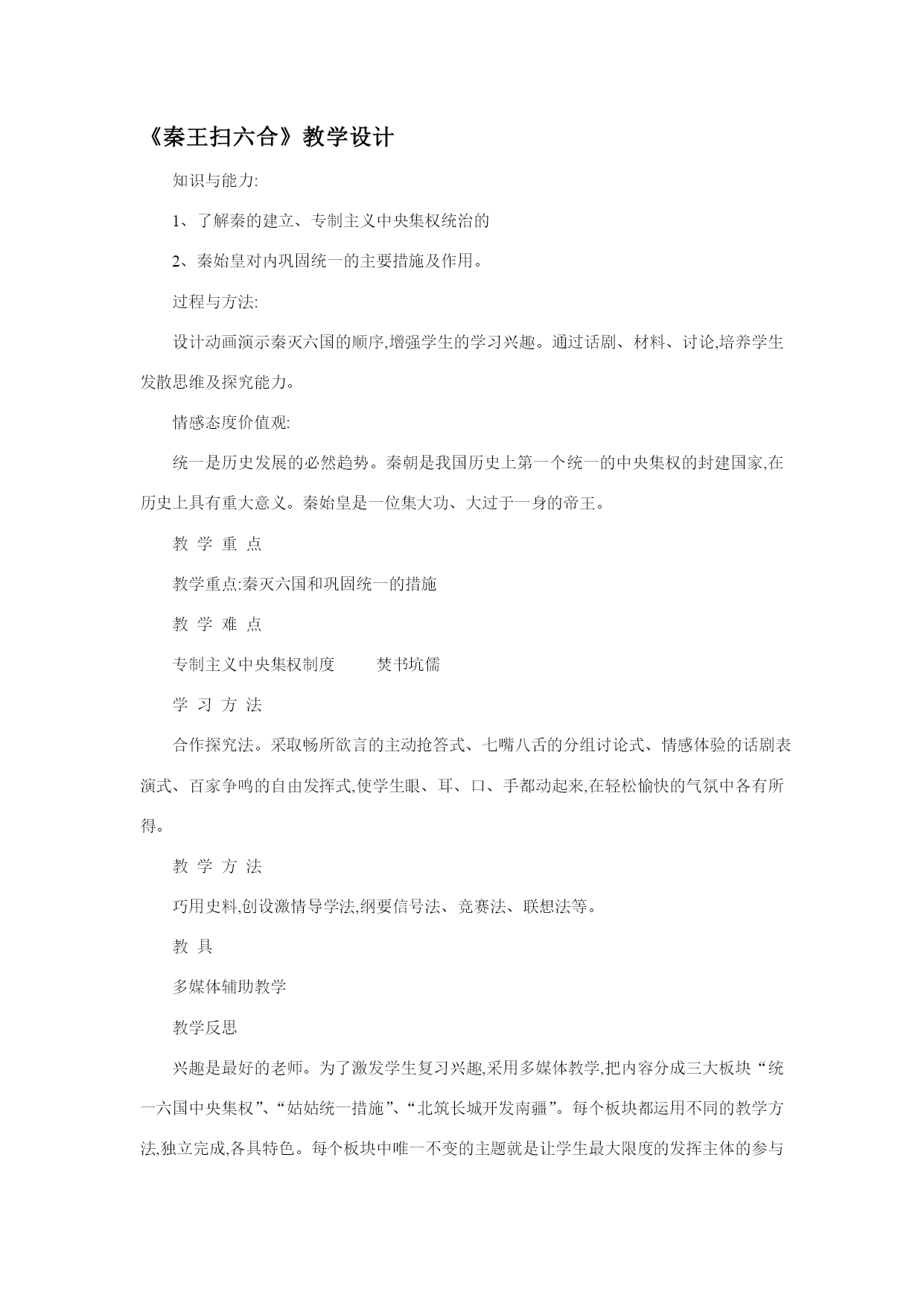 《秦王扫六合》教学设计知识与能力:1、了解秦的建立、专制主义中央集权统治的2、秦始皇对内巩固统一的主要措施及作用。过程与方法:设计动画演示秦灭六国的顺序,增强学生的学习兴趣。通过话剧、材料、讨论,培养学生发散思维及探究能力。情感态度价值观:统一是历史发展的必然趋势。秦朝是我国历史上第一个统一的中央集权的封建国家,在历史上具有重大意义。秦始皇是一位集大功、大过于一身的帝王。教学重点教学重点:秦灭六国和巩固统一的措施教学难点专制主义中央集权制度焚书坑儒学习方法合作探究法。采取畅所欲言的主动抢答式、七嘴八舌的分