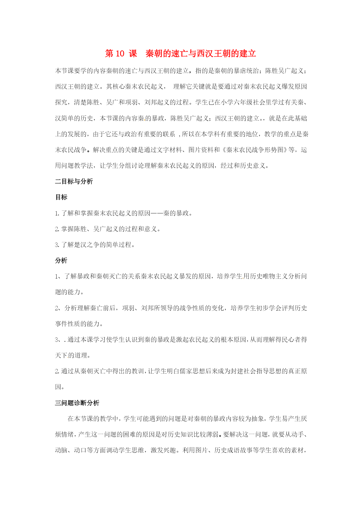 第10课秦朝的速亡与西汉王朝的建立本节课要学的内容秦朝的速亡与西汉王朝的建立,指的是秦朝的暴虐统治;陈胜吴广起义;西汉王朝的建立。其核心秦末农民起义,理解它关键就是要通过对秦末农民起义爆发原因探究,清楚陈胜、吴广和项羽、刘邦起义的过程。学生已在小学六年级社会里学过有关秦、汉简单的历史,本节课的内容秦的暴政,陈胜吴广起义;西汉王朝的建立。,就是在此基础上的发展的,由于它还与政治有重要的联系,所以在本学科有重要的地位,教学的重点是秦末农民战争。解决重点的关键是通过文字材料、图片资料和《秦末农民战争形势图》等,