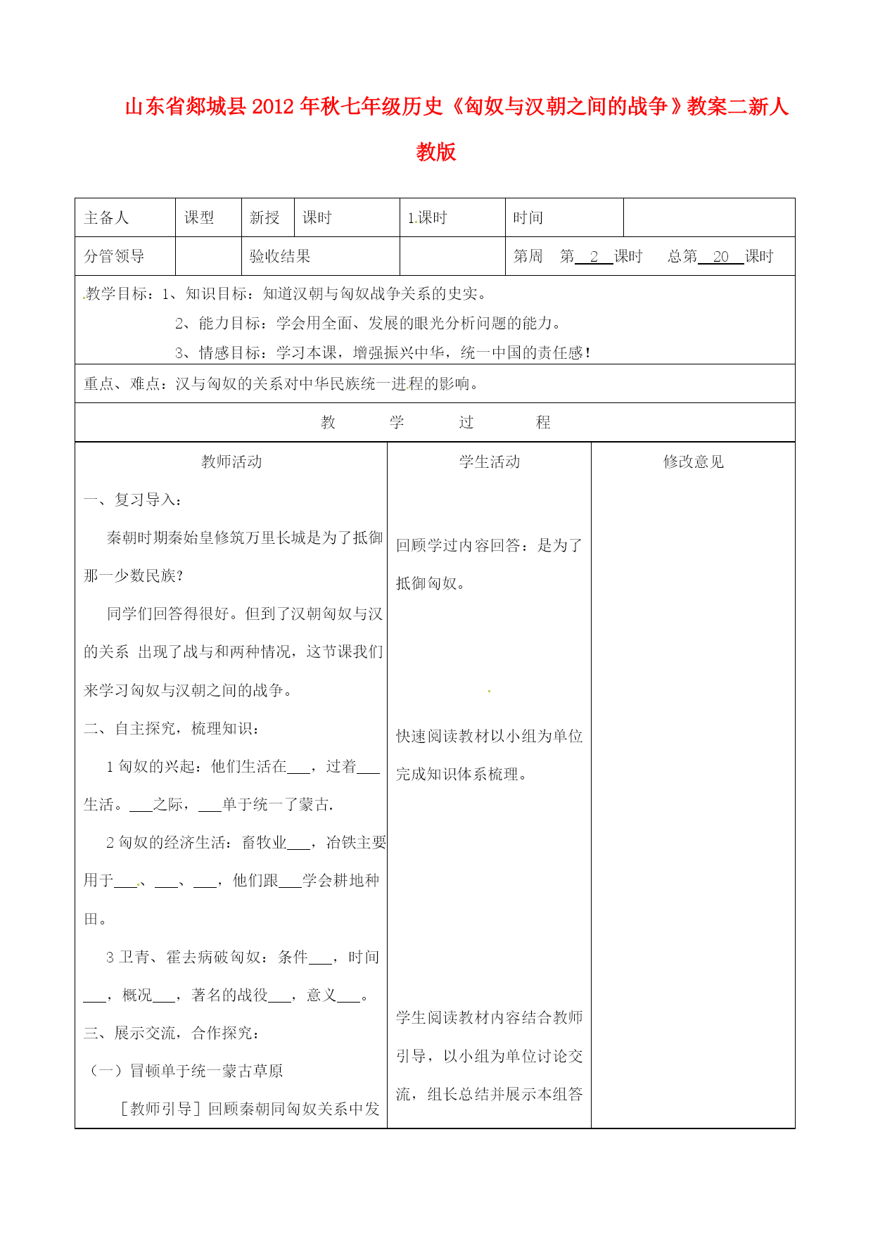 山东省郯城县2012年秋七年级历史《匈奴与汉朝之间的战争》教案二新人教版主备人课型新授课时1课时时间分管领导验收结果第周第2课时总第20课时教学目标:1、知识目标:知道汉朝与匈奴战争关系的史实。2、能力目标:学会用全面、发展的眼光分析问题的能力。3、情感目标:学习本课,增强振兴中华,统一中国的责任感!重点、难点:汉与匈奴的关系对中华民族统一进程的影响。教学过程教师活动一、复习导入:秦朝时期秦始皇修筑万里长城是为了抵御那一少数民族?同学们回答得很好。但到了汉朝匈奴与汉的关系出现了战与和两种情况,这节课我们来