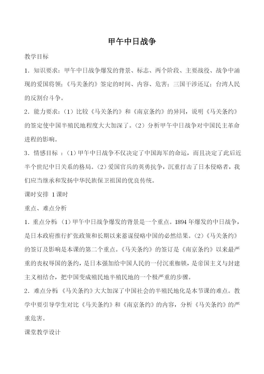 甲午中日战争教学目标1.知识要求:甲午中日战争爆发的背景、标志、两个阶段、主要战役、战争中涌现的爱国将领;《马关条约》签定的时间、内容、危害;三国干涉还辽;台湾人民的反割台斗争。2.能力要求:(1)比较《马关条约》和《南京条约》的异同,说明《马关条约》的签定使中国半殖民地程度大大加深了。(2)分析甲午中日战争对中国民主革命进程的影响。3.情感目标:(1)甲午中日战争不仅决定了中国海军的命运,而且决定了此后近半个世纪中日关系的格局。(2)爱国官兵的英勇抗争,沉重打击了日本侵略者,我们应当继承和发扬中华民族保
