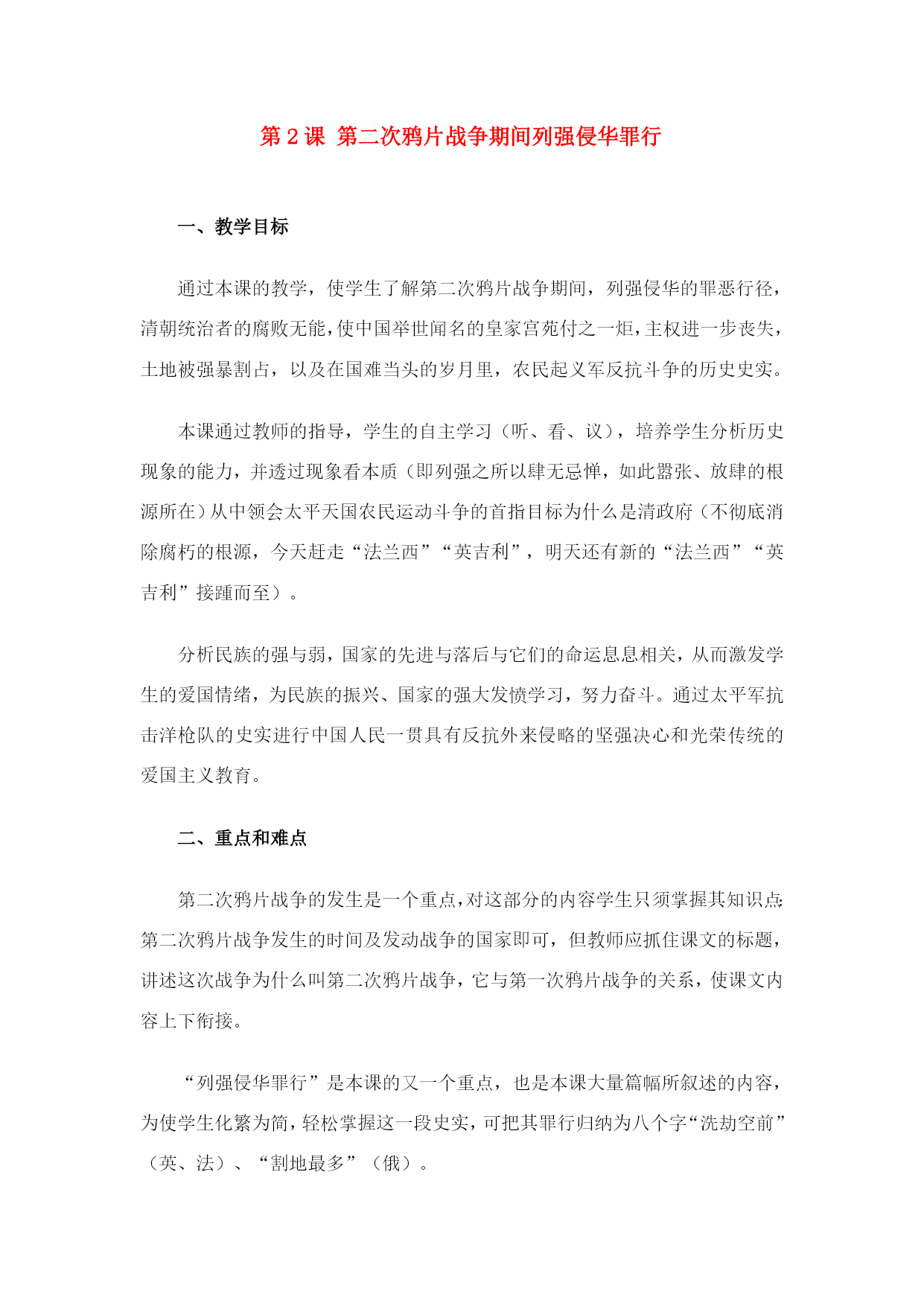 第2课第二次鸦片战争期间列强侵华罪行一、教学目标通过本课的教学,使学生了解第二次鸦片战争期间,列强侵华的罪恶行径,清朝统治者的腐败无能,使中国举世闻名的皇家宫苑付之一炬,主权进一步丧失,土地被强暴割占,以及在国难当头的岁月里,农民起义军反抗斗争的历史史实。本课通过教师的指导,学生的自主学习(听、看、议),培养学生分析历史现象的能力,并透过现象看本质(即列强之所以肆无忌惮,如此嚣张、放肆的根源所在)从中领会太平天国农民运动斗争的首指目标为什么是清政府(不彻底消除腐朽的根源,今天赶走“法兰西”“英吉利”,明天