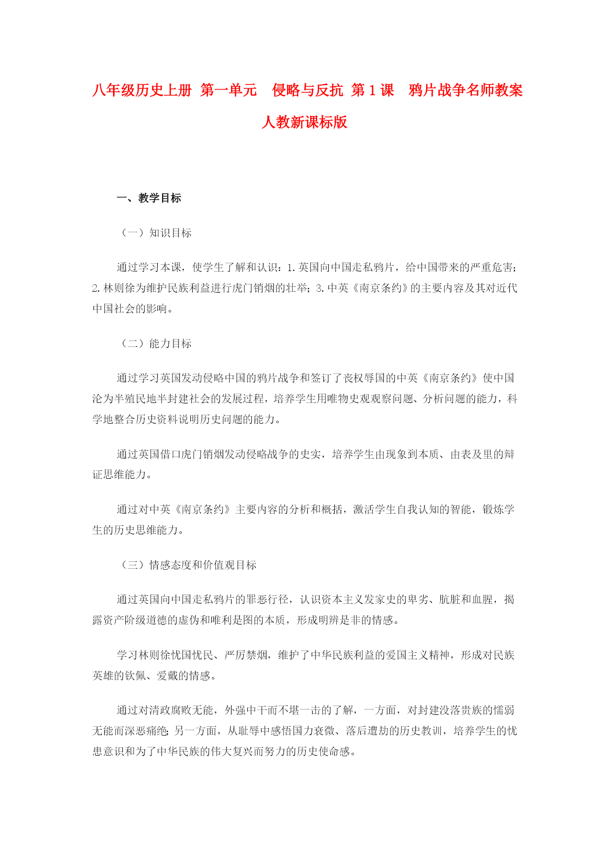 八年级历史上册第一单元侵略与反抗第1课鸦片战争名师教案人教新课标版一、教学目标(一)知识目标通过学习本课,使学生了解和认识:1.英国向中国走私鸦片,给中国带来的严重危害;2.林则徐为维护民族利益进行虎门销烟的壮举;3.中英《南京条约》的主要内容及其对近代中国社会的影响。(二)能力目标通过学习英国发动侵略中国的鸦片战争和签订了丧权辱国的中英《南京条约》使中国沦为半殖民地半封建社会的发展过程,培养学生用唯物史观观察问题、分析问题的能力,科学地整合历史资料说明历史问题的能力。通过英国借口虎门销烟发动侵略战争的史