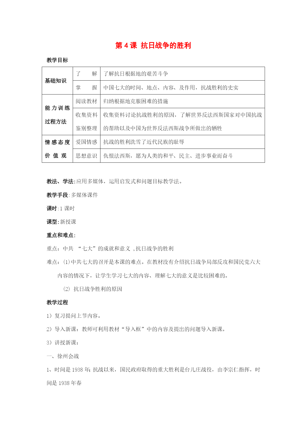 第4课抗日战争的胜利教学目标基础知识了解了解抗日根据地的艰苦斗争掌握中国七大的时间、地点、内容、及作用,抗战胜利的史实能力训练过程方法阅读教材归纳根据地克服困难的措施收集资料鉴别整理收集资料讨论抗战胜利的原因,了解世界反法西斯国家对中国抗战的帮助以及中国为世界反法西斯战争所做出的牺牲情感态度价值观爱国情感抗战的胜利洗雪了近代民族的耻辱思想意识仇恨法西斯,愿为人类的和平、民主、进步事业而奋斗教法、学法:应用多媒体,运用启发式和问题目标教学法。教学手段:多媒体课件课时:1课时课型:新授课重点和难点:重点:中共