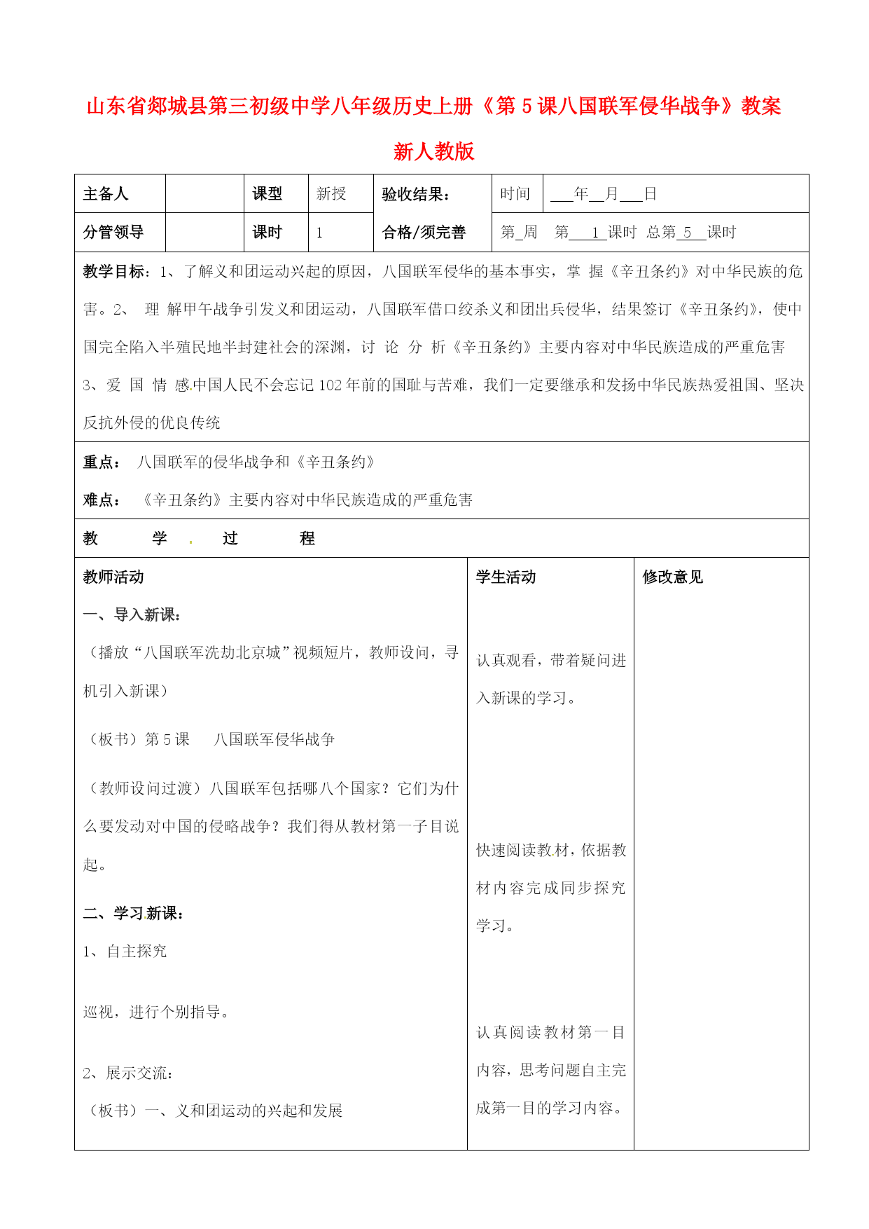 山东省郯城县第三初级中学八年级历史上册《第5课八国联军侵华战争》教案新人教版主备人课型新授验收结果:合格/须完善时间年月日分管领导课时1第周第1课时总第5课时教学目标:1、了解义和团运动兴起的原因,八国联军侵华的基本事实,掌握《辛丑条约》对中华民族的危害。2、理解甲午战争引发义和团运动,八国联军借口绞杀义和团出兵侵华,结果签订《辛丑条约》,使中国完全陷入半殖民地半封建社会的深渊,讨论分析《辛丑条约》主要内容对中华民族造成的严重危害3、爱国情感中国人民不会忘记102年前的国耻与苦难,我们一定要继承和发扬中华