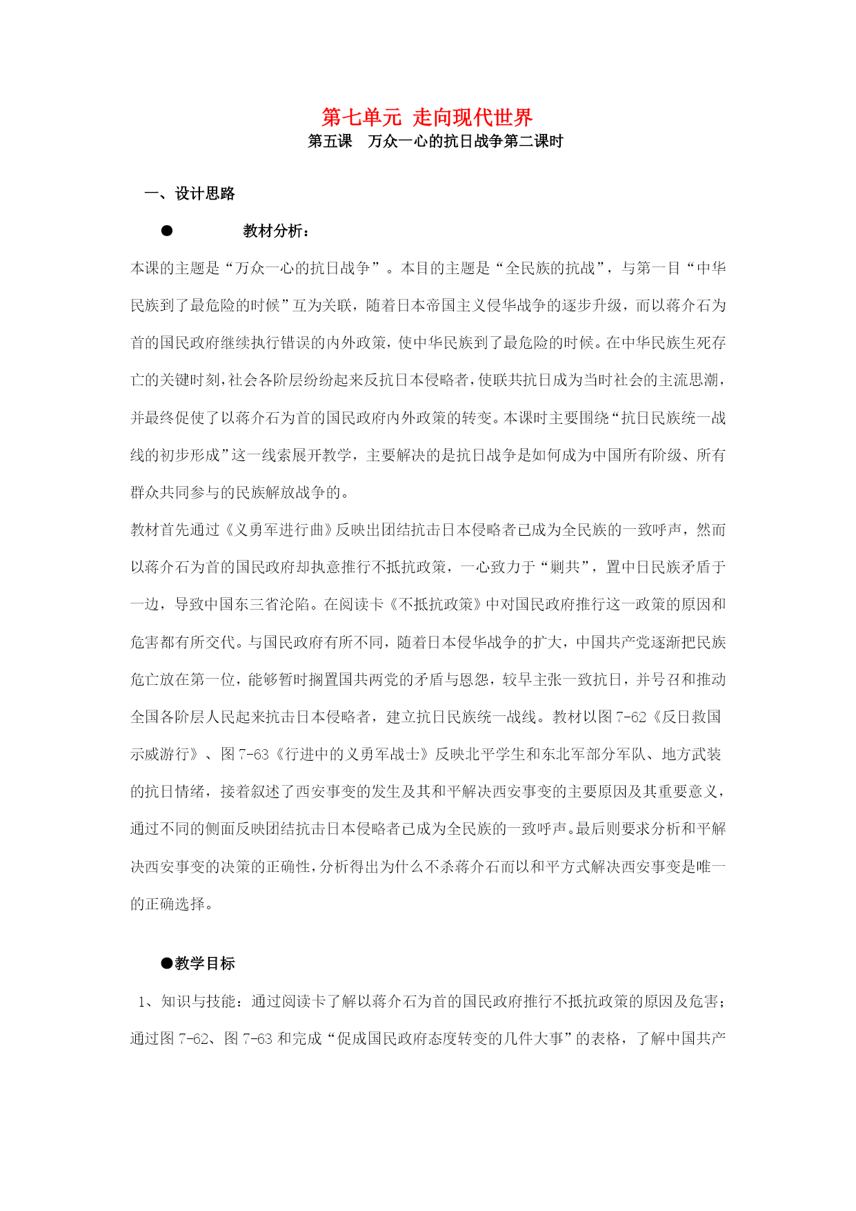 第七单元走向现代世界第五课万众一心的抗日战争第二课时一、设计思路●教材分析:本课的主题是“万众一心的抗日战争”。本目的主题是“全民族的抗战”,与第一目“中华民族到了最危险的时候”互为关联,随着日本帝国主义侵华战争的逐步升级,而以蒋介石为首的国民政府继续执行错误的内外政策,使中华民族到了最危险的时候。在中华民族生死存亡的关键时刻,社会各阶层纷纷起来反抗日本侵略者,使联共抗日成为当时社会的主流思潮,并最终促使了以蒋介石为首的国民政府内外政策的转变。本课时主要围绕“抗日民族统一战线的初步形成”这一线索展开教学,