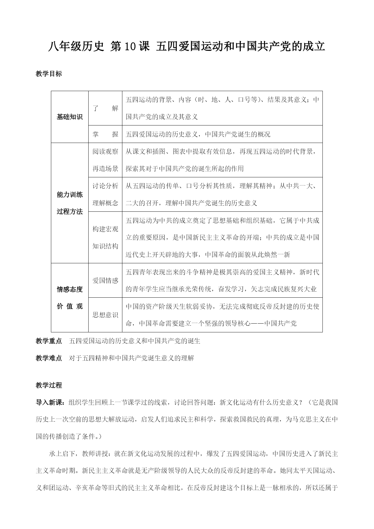 八年级历史第10课五四爱国运动和中国共产党的成立教学目标基础知识了解五四运动的背景、内容(时、地、人、口号等)、结果及其意义;中国共产党的成立及其意义掌握五四爱国运动的历史意义,中国共产党诞生的概况能力训练过程方法阅读观察再造场景从课文和插图、图表中提取有效信息,再现五四运动的时代背景,探索其对于中国共产党的诞生所起的作用讨论分析理解概念从五四运动的传单、口号分析其性质,理解其精神;从中共一大、二大的召开,理解中国共产党诞生的历史意义构建宏观知识结构五四运动为中共的成立奠定了思想基础和组织基础,它属于中共