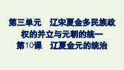 第三单元辽宋夏金多民族政权的并立与元朝的统一第10课辽夏金元的统治自主预习·新知导学自主预习·新知导学知识点一辽与西夏1.辽国的统治2.西夏的统治(1)建立:西夏的建立者是党项族,唐末在今陕北、宁夏一带形成边疆藩镇,宋初仍然保持半独立的地位。1038年,党项首领元昊称帝,定都兴庆府,国号大夏,史称西夏。(2)西夏的制度:基本模仿北宋,中央机构有汉式官称,也有一套本民族称谓的官称。知识点二金朝入主中原1.金朝建立:金朝的建立者是女真族。1115年,完颜阿骨打称帝,建立金朝,定都会宁府(上京)。1125年,金