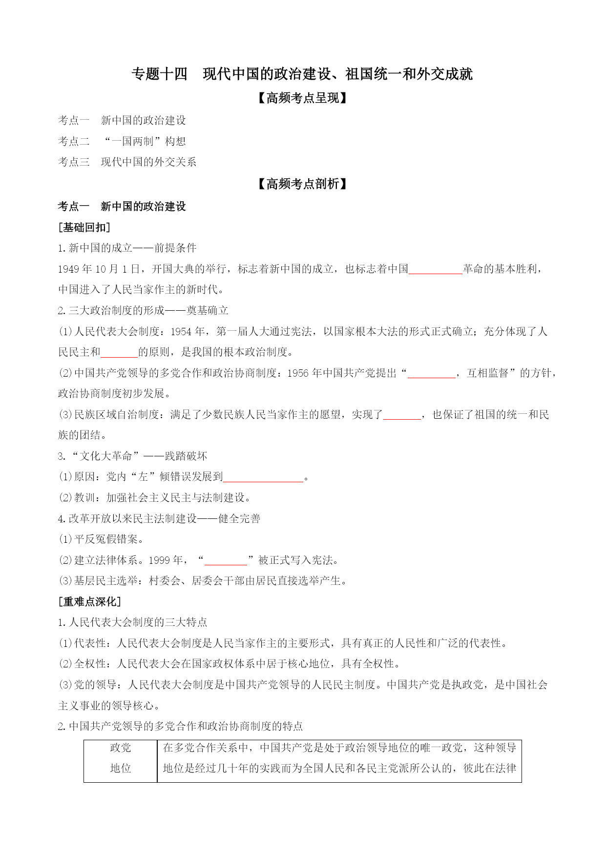 专题十四现代中国的政治建设、祖国统一和外交成就【高频考点呈现】考点一新中国的政治建设考点二“一国两制”构想考点三现代中国的外交关系【高频考点剖析】考点一新中国的政治建设[基础回扣]1.新中国的成立——前提条件1949年10月1日,开国大典的举行,标志着新中国的成立,也标志着中国革命的基本胜利,中国进入了人民当家作主的新时代。2.三大政治制度的形成——奠基确立(1)人民代表大会制度:1954年,第一届人大通过宪法,以国家根本大法的形式正式确立;充分体现了人民民主和的原则,是我国的根本政治制度。(2)中国共产