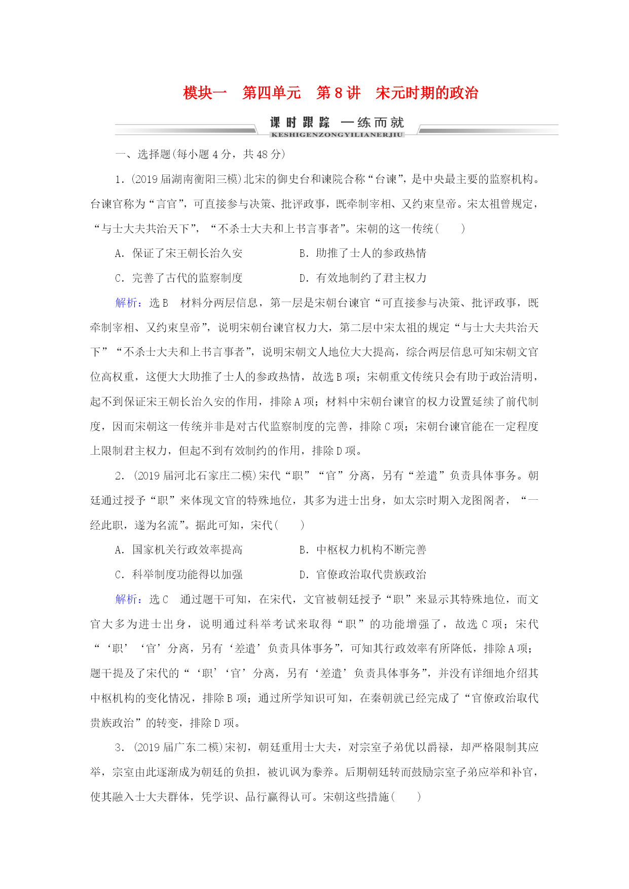 模块一第四单元第8讲宋元时期的政治一、选择题(每小题4分,共48分)1.(2019届湖南衡阳三模)北宋的御史台和谏院合称“台谏”,是中央最主要的监察机构。台谏官称为“言官”,可直接参与决策、批评政事,既牵制宰相、又约束皇帝。宋太祖曾规定,“与士大夫共治天下”,“不杀士大夫和上书言事者”。宋朝的这一传统()A.保证了宋王朝长治久安B.助推了士人的参政热情C.完善了古代的监察制度D.有效地制约了君主权力解析:选B材料分两层信息,第一层是宋朝台谏官“可直接参与决策、批评政事,既牵制宰相、又约束皇帝”,说明宋朝台