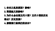 1.安史之乱的原因?影响?2.黄巢起义的影响?3.为什么会出现五代十国?五代十国的历史特点?历史发展?4.唐朝衰亡给我们的启示?宋太祖即位后的一天,与石守信等大将饮酒,酒兴正浓时,宋太祖说:“我当上皇帝全靠你们,可现在我整夜都睡不安宁。”众将忙问其故,宋太祖答道:“如果有一天,你们也被部下黄袍加身,你们也会身不由己啊。”众将知道受到猜疑,便请宋太祖指明一条生路。宋太祖让他们回家置产,享受清福。第二天,这些大将纷纷称病辞职,交出兵权。这就是“杯酒释兵权”故事的来历。北宋的政治1、一位学生在其研究性学习论文中