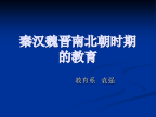 秦汉魏晋南北朝时期的教育第一节秦汉文化教育政策(四)禁止私学,焚书坑儒李斯:私学师古非今,扰乱视听,非议法教。进而提出“挟书”之策。公元前212年,有儒生诽谤秦始皇后逃亡,秦始皇大肆株连搜捕,发生了坑杀(活埋)460个儒生的极端事件。(五)以法为教、以吏为师“若欲有学法令,以吏为师。”二、汉代“独尊儒术”文教政策的确立(一)设五经博士博士是掌管典籍簿册的咨政议政官员,诸子、术数、方技等都立博士。汉武帝建元五年(前136年)“置五经博士。”(二)建立博士弟子制元朔五年(前124年)汉武帝采纳丞相公孙弘的建议