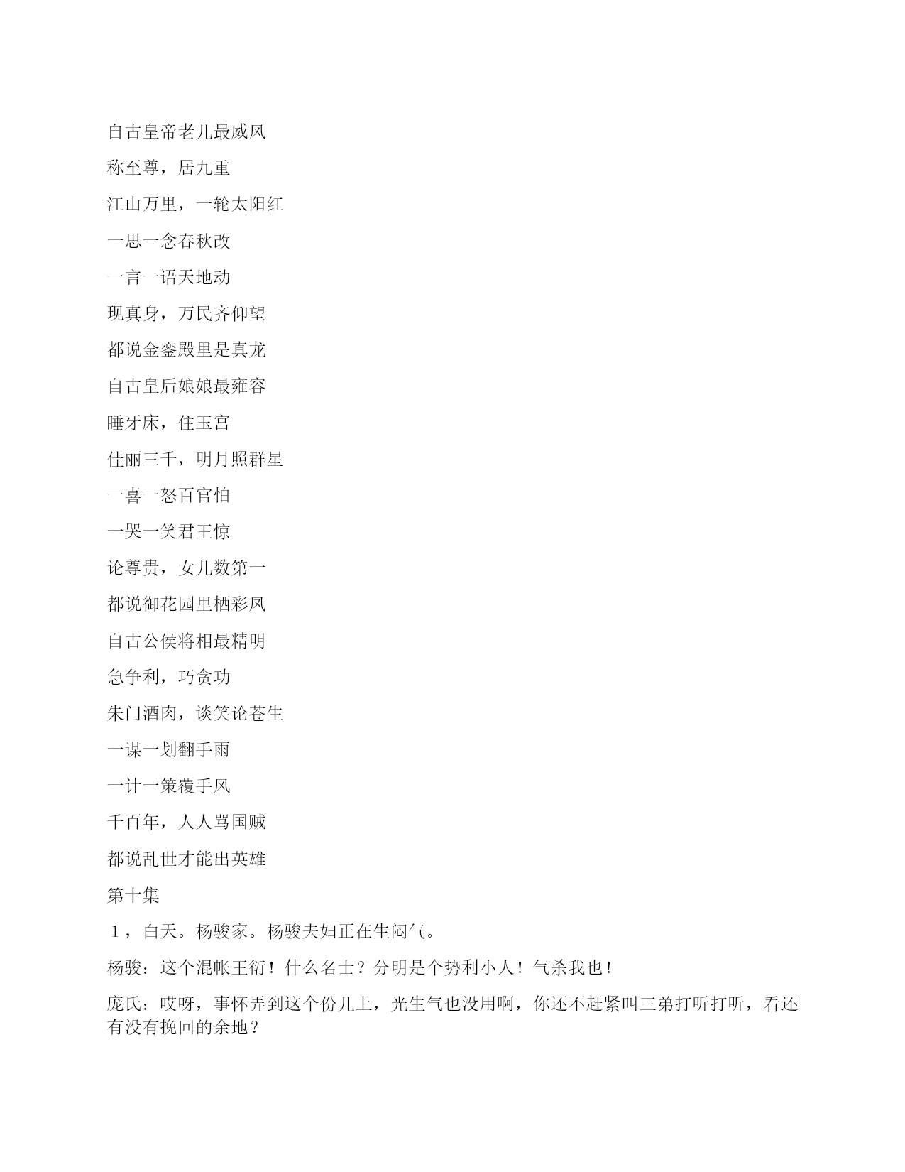 自古皇帝老儿最威风称至尊,居九重江山万里,一轮太阳红一思一念春秋改一言一语天地动现真身,万民齐仰望都说金銮殿里是真龙自古皇后娘娘最雍容睡牙床,住玉宫佳丽三千,明月照群星一喜一怒百官怕一哭一笑君王惊论尊贵,女儿数第一都说御花园里栖彩凤自古公侯将相最精明急争利,巧贪功朱门酒肉,谈笑论苍生一谋一划翻手雨一计一策覆手风千百年,人人骂国贼都说乱世才能出英雄第十集1,白天。杨骏家。杨骏夫妇正在生闷气。杨骏:这个混帐王衍!什么名士?分明是个势利小人!气杀我也!庞氏:哎呀,事怀弄到这个份儿上,光生气也没用啊,你还不赶紧叫