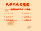 民族文化的瑰宝——辉煌的中国古代工艺美术一、古文化的彩带丝绸之路丝绸之路是古代中国走向世界之路,它是中华民族向全世界展示其伟大创造力和灿烂文明的门户,也是古代中国得以与西方文明交融交汇、共同促进世界文明进程的合璧之路。十九世纪,德国地质学家首次将这条最初运输丝绸的交通要道称为“丝绸之路”。中国的丝绸之路早在公元前已分为海陆两路。就陆路而言,有西汉张骞开通西域的官方通道“西北绿丝绸之路”、长城以北充满着血腥和暴力的“北方草原丝绸之路”和四川云南山道崎岖的“西南丝绸之路”;海路则有风平浪静的“海上丝绸之路”,