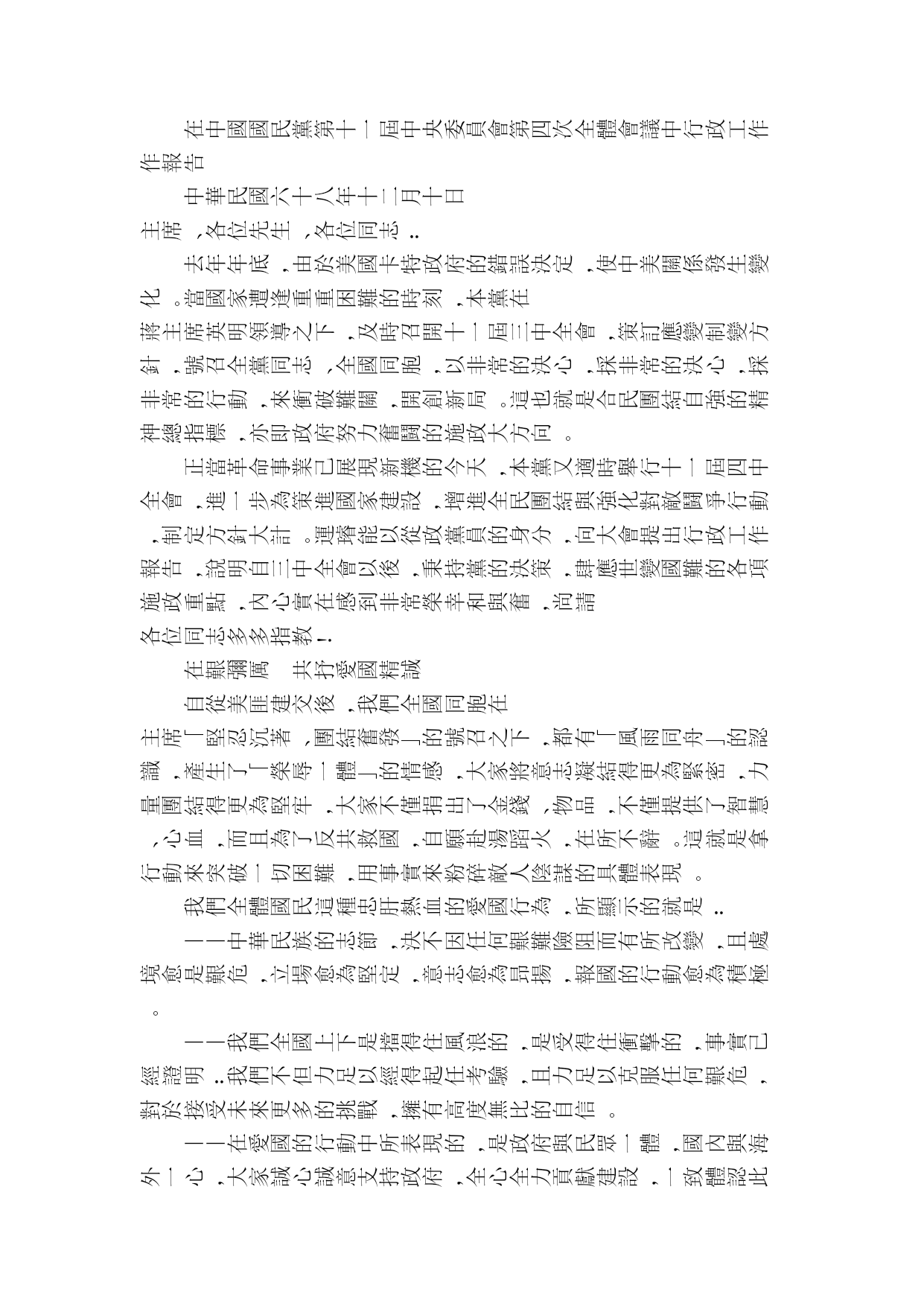 在中國國民黨第十一屆中央委員會第四次全體會議中行政工作作報告中華民國六十八年十二月十日主席、各位先生、各位同志:去年年底,由於美國卡特政府的錯誤決定,使中美關係發生變化。當國家遭逢重重困難的時刻,本黨在蔣主席英明領導之下,及時召開十一屆三中全會,策訂應變制變方針,號召全黨同志、全國同胞,以非常的決心,採非常的決心,採非常的行動,來衝破難關,開創新局。這也就是合民團結自強的精神總指標,亦即政府努力奮鬪的施政大方向。正當革命事業已展現新機的今天,本黨又適時舉行十一屆四中全會,進一步為策進國家建設,增進全民團結