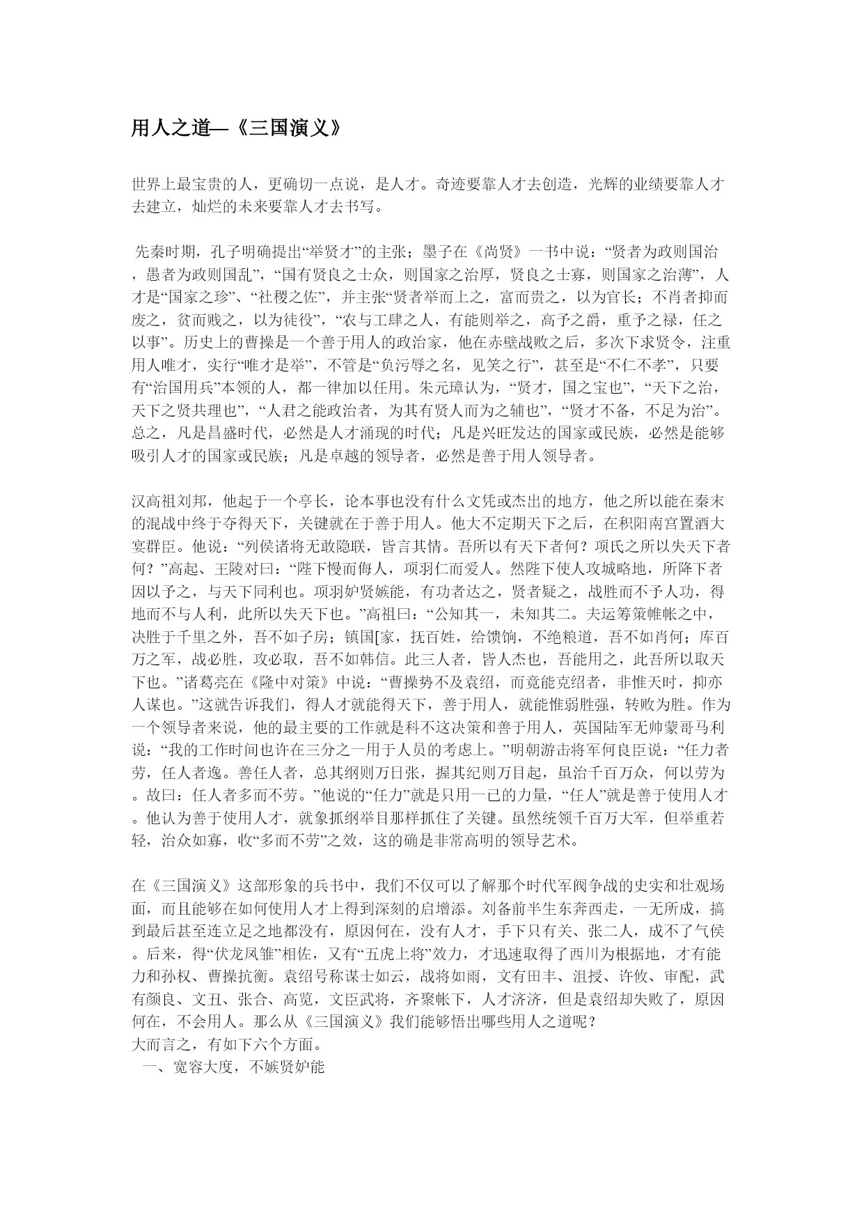 用人之道—《三国演义》世界上最宝贵的人,更确切一点说,是人才。奇迹要靠人才去创造,光辉的业绩要靠人才去建立,灿烂的未来要靠人才去书写。先秦时期,孔子明确提出“举贤才”的主张;墨子在《尚贤》一书中说:“贤者为政则国治,愚者为政则国乱”,“国有贤良之士众,则国家之治厚,贤良之士寡,则国家之治薄”,人才是“国家之珍”、“社稷之佐”,并主张“贤者举而上之,富而贵之,以为官长;不肖者抑而废之,贫而贱之,以为徒役”,“农与工肆之人,有能则举之,高予之爵,重予之禄,任之以事”。历史上的曹操是一个善于用人的政治家,他在赤