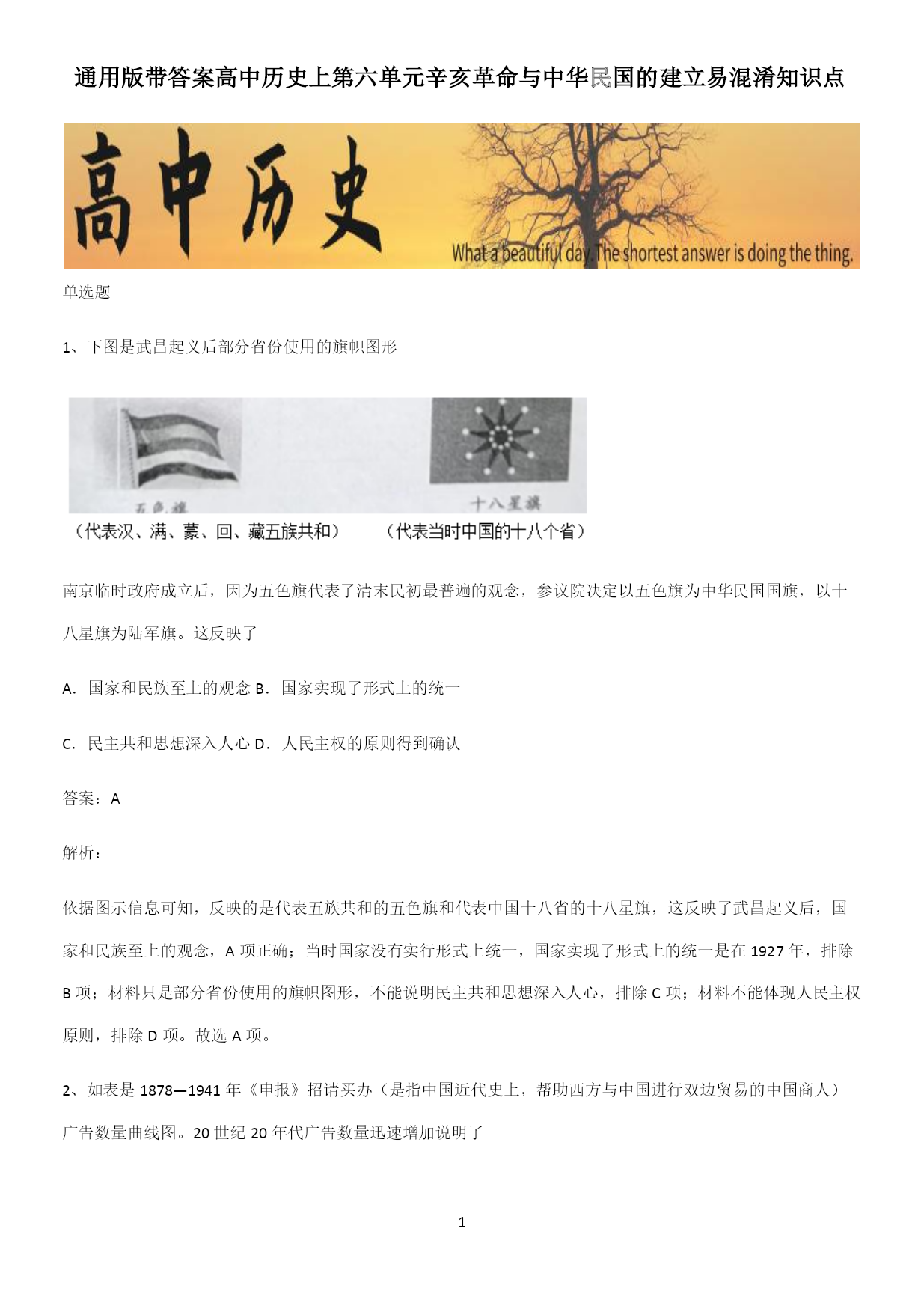 PAGE\*MERGEFORMAT1通用版带答案高中历史上第六单元辛亥革命与中华民国的建立易混淆知识点PAGE\*MERGEFORMAT22单选题1、下图是武昌起义后部分省份使用的旗帜图形南京临时政府成立后,因为五色旗代表了清末民初最普遍的观念,参议院决定以五色旗为中华民国国旗,以十八星旗为陆军旗。这反映了A.国家和民族至上的观念B.国家实现了形式上的统一C.民主共和思想深入人心D.人民主权的原则得到确认答案:A解析:依据图示信息可知,反映的是代表五族共和的五色旗和代表中国十八省的十八星旗,这