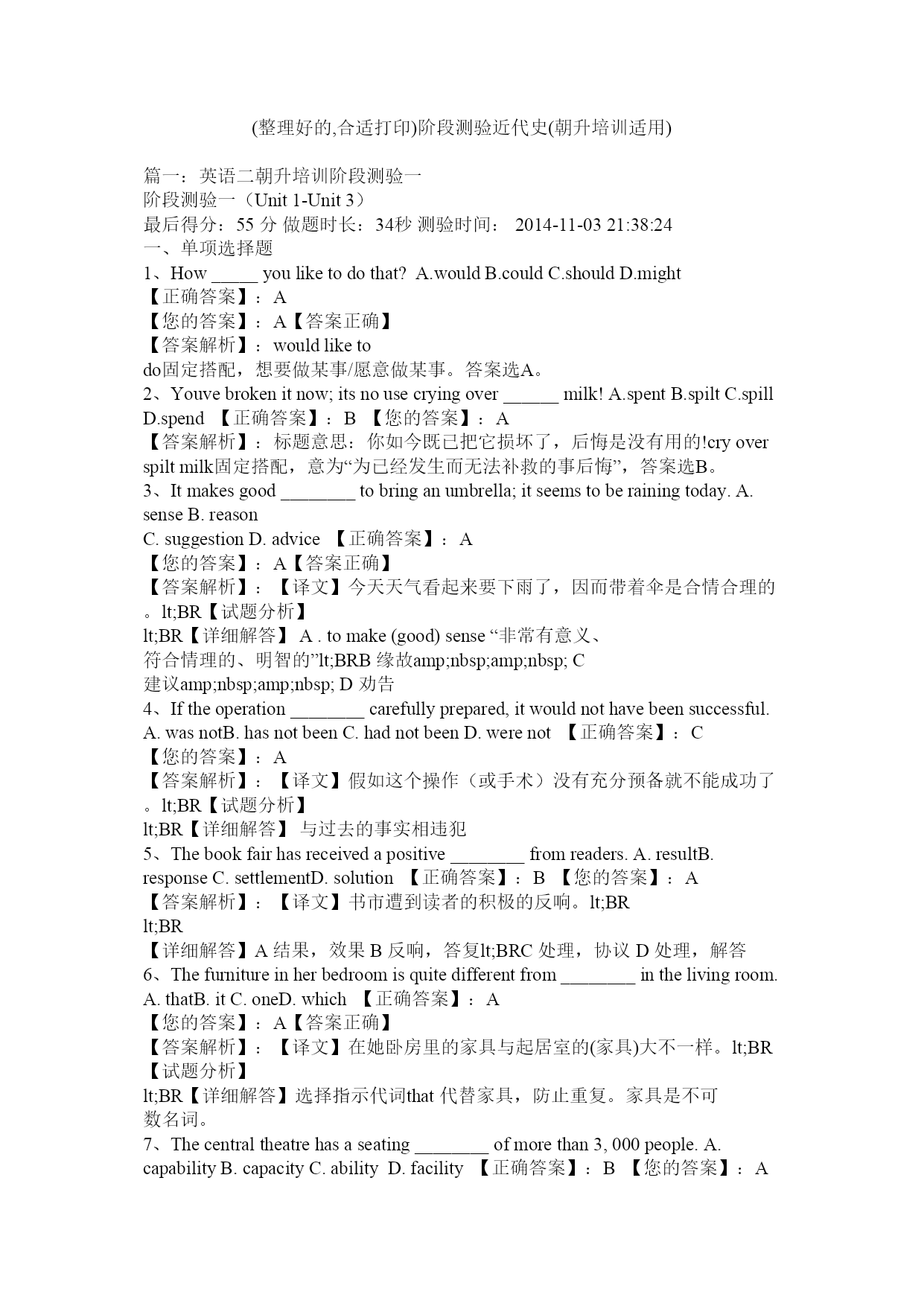 (整理好的,合适打印)阶段测验近代史(朝升培训适用)篇一:英语二朝升培训阶段测验一阶段测验一(Unit1-Unit3)最后得分:55分做题时长:34秒测验时间:2014-11-0321:38:24一、单项选择题1、How_____youliketodothat?A.wouldB.couldC.shouldD.might【正确答案】:A【您的答案】:A【答案正确】【答案解析】:wouldliketodo固定搭配,想要做某事/愿意做某事。答案选A。2、Youvebrokenitnow;itsnousecryi