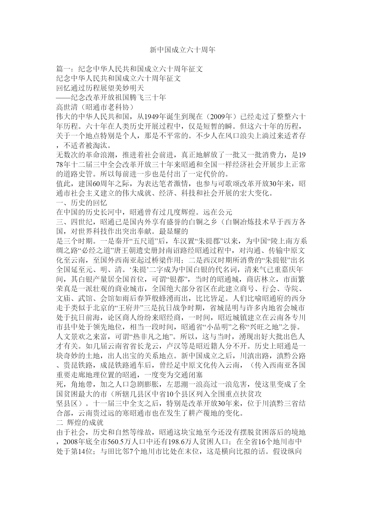 新中国成立六十周年篇一:纪念中华人民共和国成立六十周年征文纪念中华人民共和国成立六十周年征文回忆通过历程展望美妙明天——纪念改革开放祖国腾飞三十年高世清(昭通市老科协)伟大的中华人民共和国,从1949年诞生到现在(2009年)已经走过了整整六十年历程。六十年在人类历史开展过程中,仅是短暂的瞬。但这六十年的历程,关于一个地点特别是个人,那是不平常的。不少人在风口浪尖上淌过来适者存,不适者被淘汰。无数次的革命浪潮,推进着社会前进,真正地解放了一批又一批消费力,是1978年十二届三中全会改革开放三十年来昭通和全