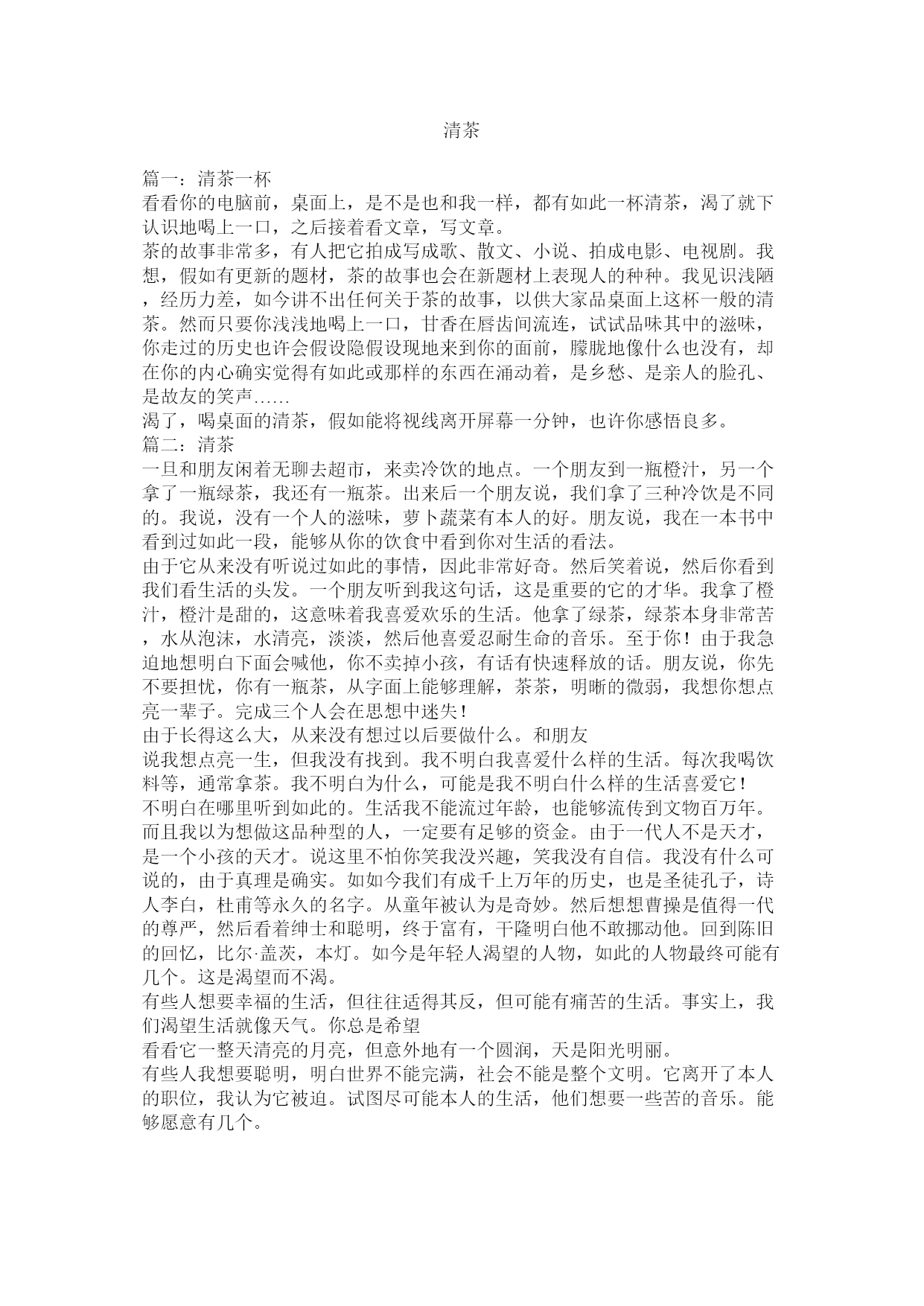 清茶篇一:清茶一杯看看你的电脑前,桌面上,是不是也和我一样,都有如此一杯清茶,渴了就下认识地喝上一口,之后接着看文章,写文章。茶的故事非常多,有人把它拍成写成歌、散文、小说、拍成电影、电视剧。我想,假如有更新的题材,茶的故事也会在新题材上表现人的种种。我见识浅陋,经历力差,如今讲不出任何关于茶的故事,以供大家品桌面上这杯一般的清茶。然而只要你浅浅地喝上一口,甘香在唇齿间流连,试试品味其中的滋味,你走过的历史也许会假设隐假设现地来到你的面前,朦胧地像什么也没有,却在你的内心确实觉得有如此或那样的东西在涌动着