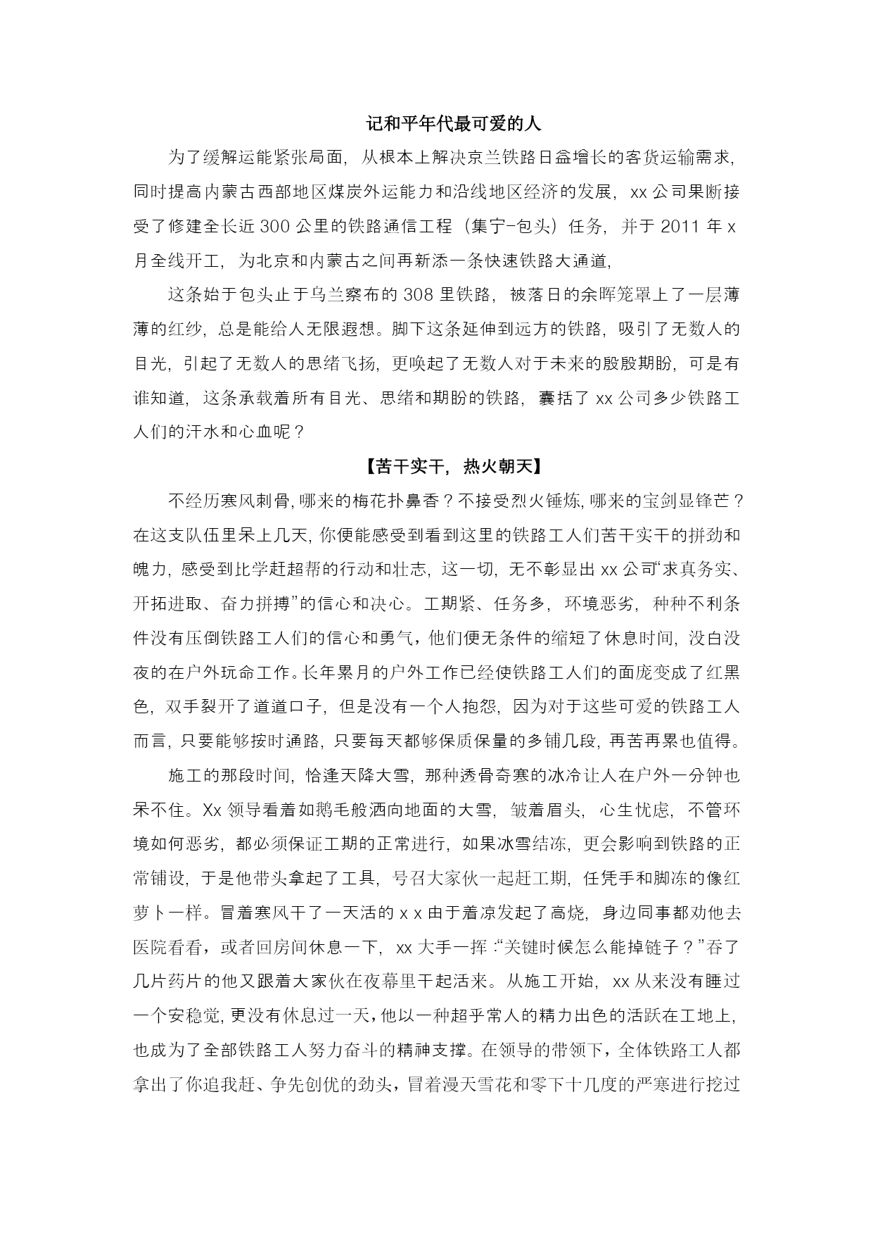 记和平年代最可爱的人为了缓解运能紧张局面,从根本上解决京兰铁路日益增长的客货运输需求,同时提高内蒙古西部地区煤炭外运能力和沿线地区经济的发展,xx公司果断接受了修建全长近300公里的铁路通信工程(集宁-包头)任务,并于2011年x月全线开工,为北京和内蒙古之间再新添一条快速铁路大通道,这条始于包头止于乌兰察布的308里铁路,被落日的余晖笼罩上了一层薄薄的红纱,总是能给人无限遐想。脚下这条延伸到远方的铁路,吸引了无数人的目光,引起了无数人的思绪飞扬,更唤起了无数人对于未来的殷殷期盼,可是有谁知道,这条承载着