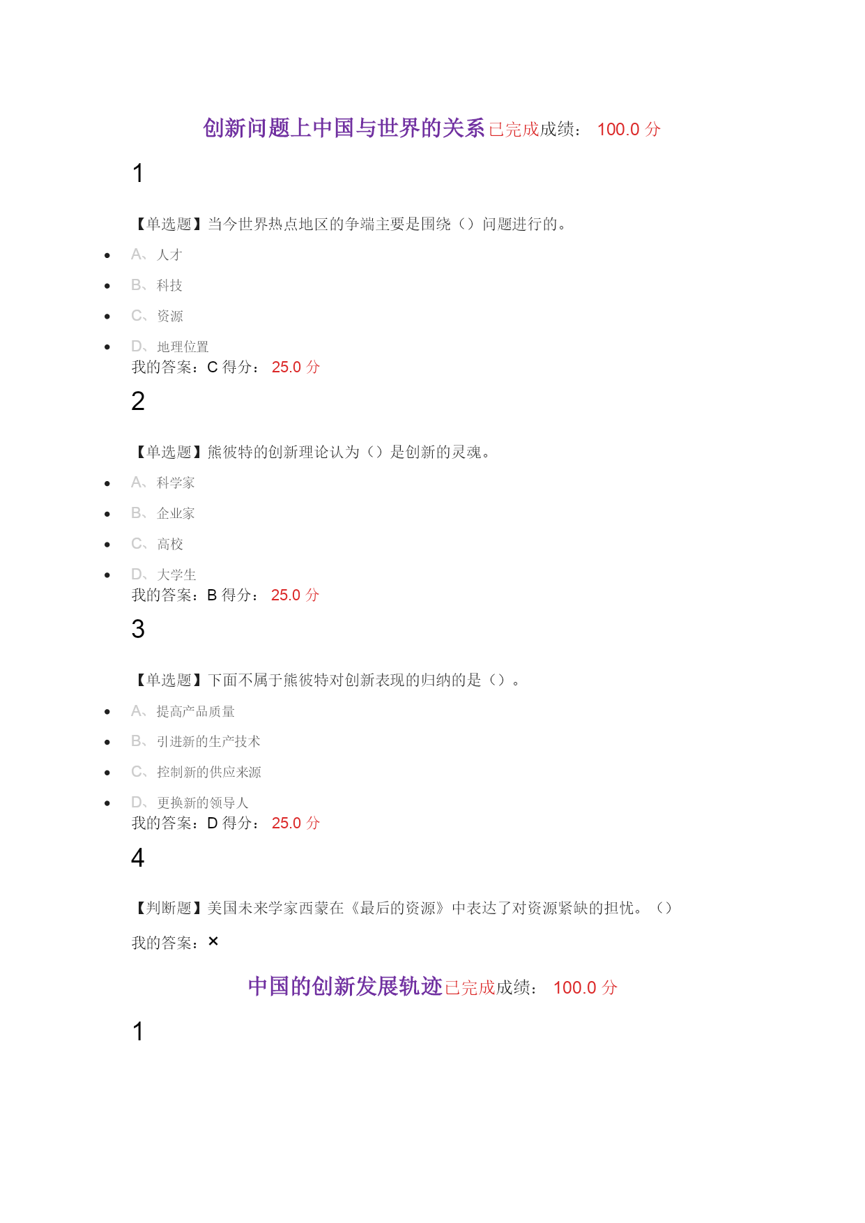 创新问题上中国与世界的关系已完成成绩:100.0分1【单选题】当今世界热点地区的争端主要是围绕()问题进行的。窗体顶端A、HYPERLINK"javascript:void(0)"人才B、HYPERLINK"javascript:void(0)"科技C、HYPERLINK"javascript:void(0)"资源D、HYPERLINK"javascript:void(0)"地理位置我的答案:C得分:25.0分窗体底端2【单选题】熊彼特的创新理论认为()是创新的灵魂。窗体顶端A、