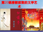 第20课清朝前期的文学艺术教学目标一、掌握《红楼梦》的作者、题材、文学特色和文学地位。二、掌握京剧的形成过程,认识它在中国戏剧界的地位。教学要点一、不朽的文学名著二、中国国粹——京剧自觉导航一、不朽的文学名著1、清代小说数量繁多,题材多样。其中最为著名的小说代表作品是什么?2、《红楼梦》的作者是谁?该小说以哪四大家族为背景?描写了哪两个主人公的爱情悲剧,从而对封建礼教的有力鞭策?二、中国国粹——京剧1、中国戏剧历史悠久,种类繁多,到了清代戏曲进一步发展,其中最为杰出的代表是什么?2、在什么时期京剧逐渐形成