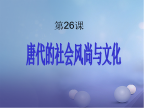 第26课唐代的社会风尚与文化导语一、多元开放的社会风尚2、在唐代,大量来自中亚、西亚的移民进入中原地区,许多外来宗教也随之传播。唐朝推行开门的宗教政策,允许信徒建寺传教,使唐代的宗教文化呈现多元的特点。3、唐代的社会风气比较开放,妇女有较高的社会地位,在婚姻方面也比较独立自主。善思二、五彩纷呈的唐诗李白李白杜甫杜甫白居易开卷有益学而时习温故知新集思广益