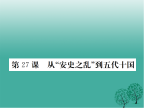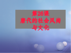 唐代的社会风尚与文化衣食住行时尚衣食住行时尚食饮茶习俗在唐代风靡全国,茶成为一种生活必需品行繁荣开放的社会生活唐朝长安人流行穿耶!唐代圆领袍衫及幞头唐朝仕女博大宏放的精神风貌博大宏放的精神风貌2、特点美国的唐人街拉美的唐人街唐朝是诗歌的黄金时代望庐山瀑布日照香炉生紫烟,遥看瀑布挂前川。飞流直下三千尺,疑是银河落九天。李白,字太白,少年好学,喜欢文学。他“一生好入名山游”,青年时即离开家乡漫游祖国的大江南北。后被唐玄宗召为文学侍从。但当时政治日渐腐败,不到两年,李白便因得罪权贵,离开了朝廷,继续漫游各地写下
