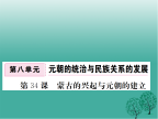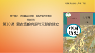 第二单元·辽宋夏金元时期:民族关系的发展和社会变化他们属于哪个少数民族?一、成吉思汗统一蒙古蒙古包有星的天旋转着,众百姓反了,不进自己的卧内,互相抢掠财物。有草皮的地翻转着,众部百姓反了,不卧自己被儿里,互相攻打。——《蒙古秘史》江山如此多娇,引无数英雄竞折腰。惜秦皇汉武,略输文采;唐宗宋祖,稍逊风骚。一代天骄,成吉思汗,只识弯弓射大雕。俱往矣,数风流人物,还看今朝。——沁园春·雪铁木真统一蒙古各部一代天骄,成吉思汗。——毛泽东《沁园春·雪》探究一:你认为成吉思汗成功的原因有哪些?1、政治:建立军政合一的