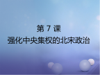 第7课强化中央集权的北宋政治一、宋朝的建立思考:宋太祖称帝后,一个严峻的问题摆在他的面前,就是:五代以来,兵家夺权,战争不休,统治者的地位极不稳固。好我们来看看宋太祖是怎样解决这个问题的?二.加强中央集权的举措宋太祖问:“天下自唐季以来,兵戈不息,苍生涂地,其故如何也?吾欲息天下之兵,为国家长久之计,其道如何?”(二)措施“杯酒释兵权”与“兔死狗烹”的做法有什么不同?2.强化君权北宋加强中央集权的措施,虽然铲除了藩镇割据的基础,但却导致官僚机构的迅速膨胀。到北宋中期,各级官僚达到17000多人。这比实际所