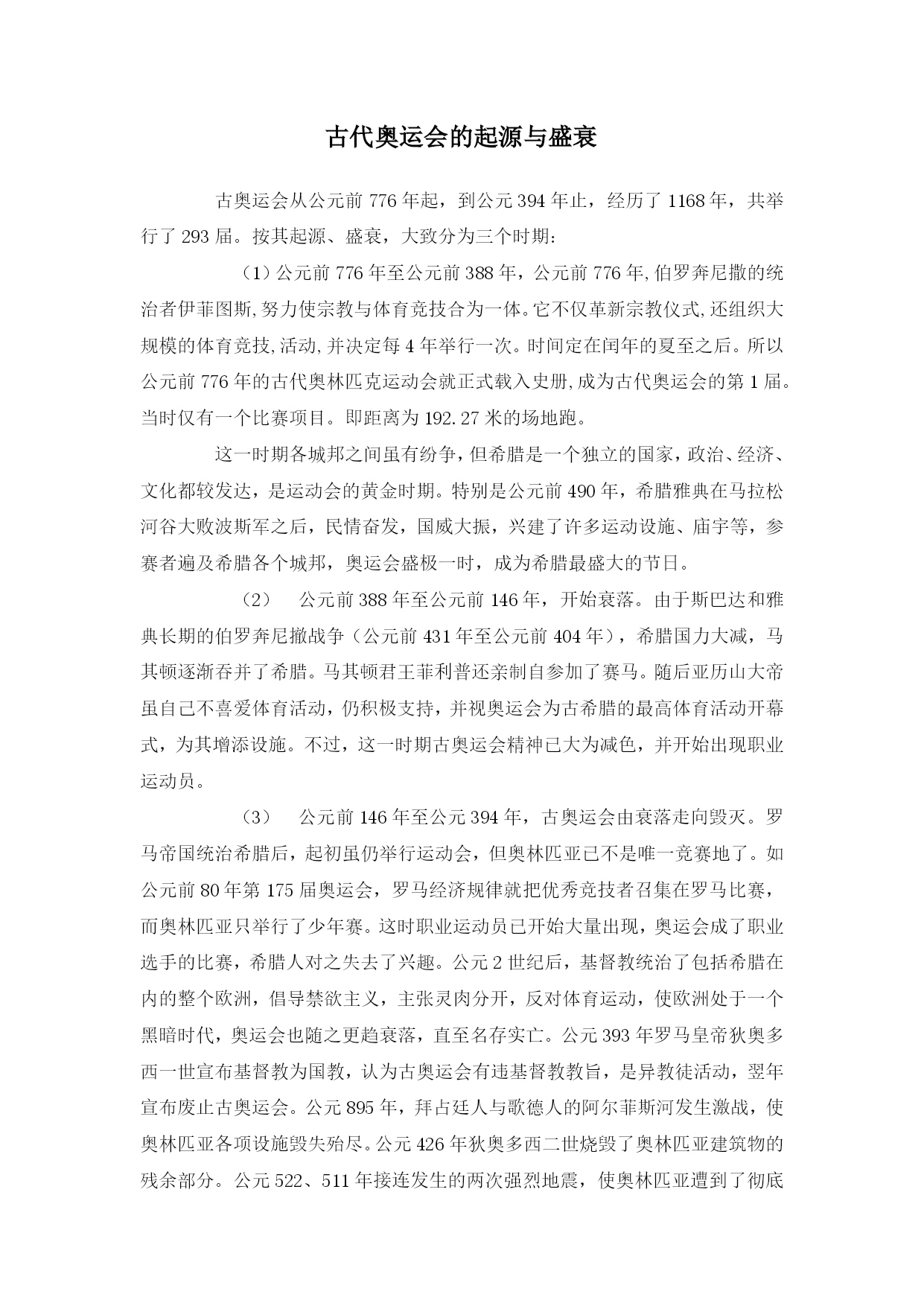 古代奥运会的起源与盛衰古奥运会从公元前776年起,到公元394年止,经历了1168年,共举行了293届。按其起源、盛衰,大致分为三个时期:(1)公元前776年至公元前388年,公元前776年,伯罗奔尼撒的统治者伊菲图斯,努力使宗教与体育竞技合为一体。它不仅革新宗教仪式,还组织大规模的体育竞技,活动,并决定每4年举行一次。时间定在闰年的夏至之后。所以公元前776年的古代奥林匹克运动会就正式载入史册,成为古代奥运会的第1届。当时仅有一个比赛项目。即距离为192.27米的场地跑。这一时期各城邦之间虽有纷争,但希